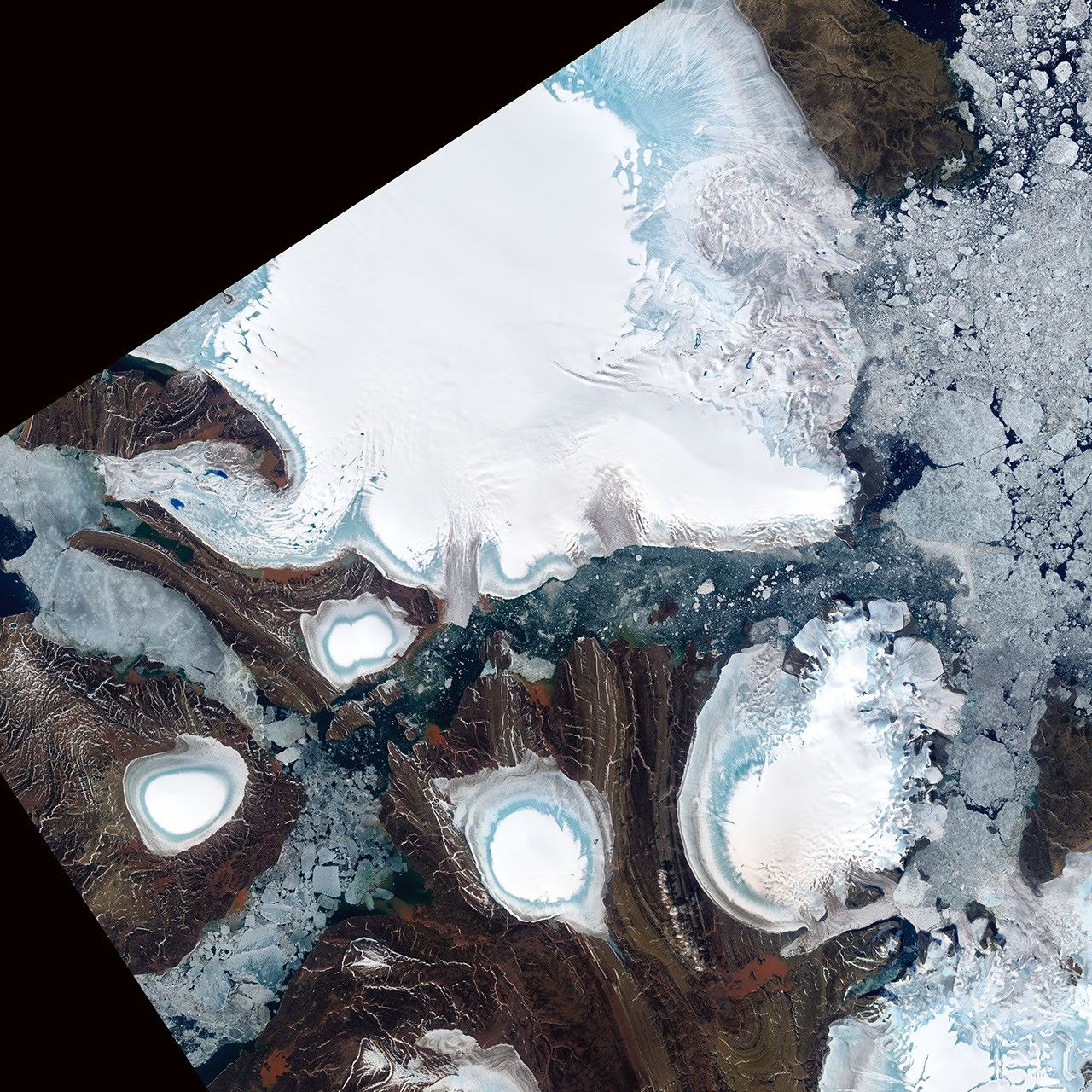 The wide view (second image) shows ice caps dotting the surface. The Academy of Sciences Ice Cap is the archipelago’s largest at 5,575 square kilometers (2,152 square miles). Some of the edges of the ice rest on land and others stretch over seawater. Ice loss occurs from surface melting and from the shedding of icebergs. Thin, broken sea ice chokes the water in the straits.