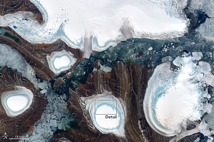 The wide view (second image) shows ice caps dotting the surface. The Academy of Sciences Ice Cap is the archipelago’s largest at 5,575 square kilometers (2,152 square miles). Some of the edges of the ice rest on land and others stretch over seawater. Ice loss occurs from surface melting and from the shedding of icebergs. Thin, broken sea ice chokes the water in the straits.
