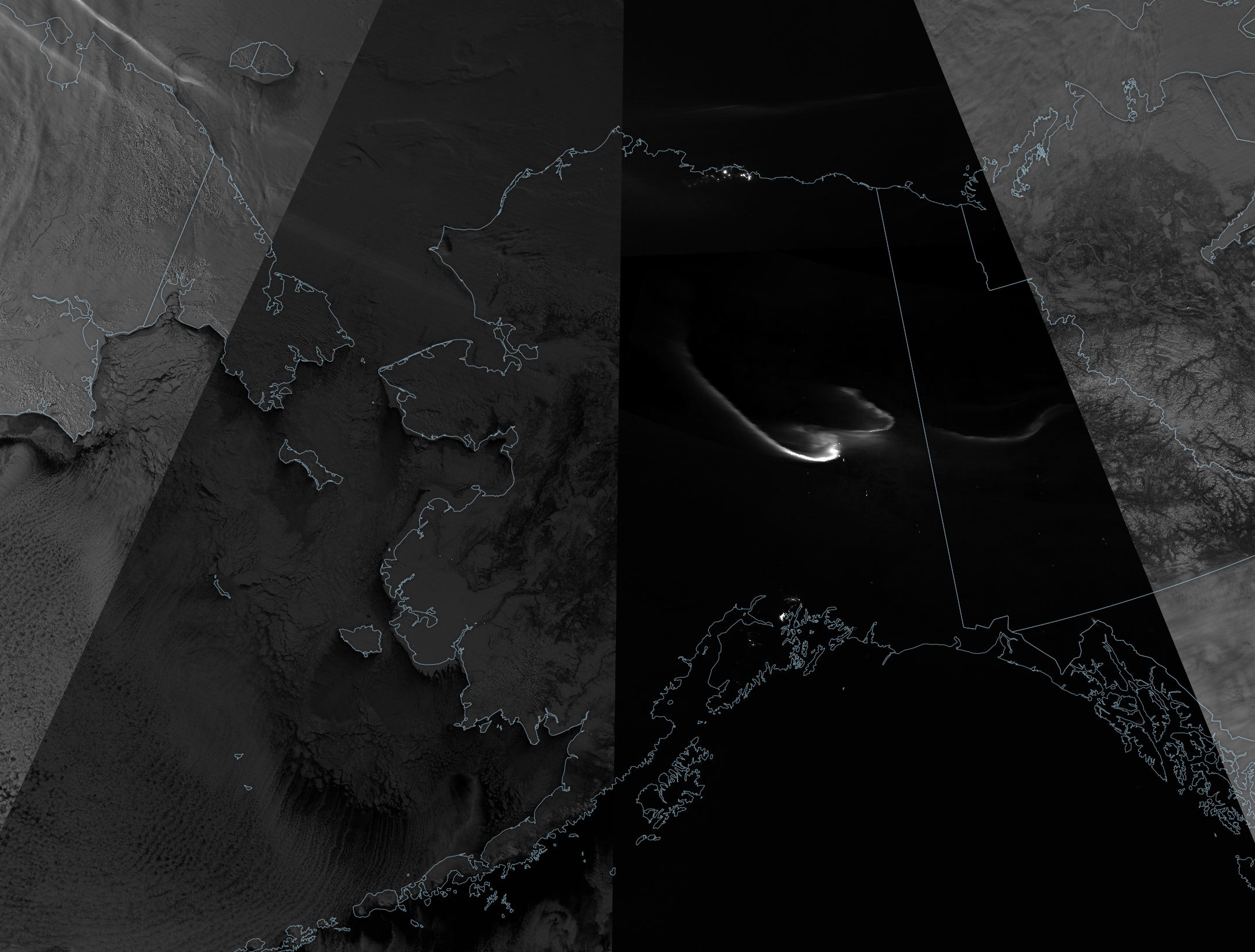 When the satellite passed over western Alaska and the Bering Strait, at 13:00 Universal Time (4:00 a.m. Alaska Standard Time), the eclipse was in the partial phase. The scene is noticeably brighter than the earlier one, and light from the partially shaded Moon illuminates snow-covered topography and offshore clouds. The brightest swaths on the far right and left sides were acquired before and after the eclipse, respectively, with light from the full Moon.