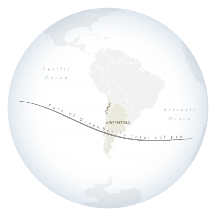 The shadow cast by an eclipse consists of the completely darkened umbra and the partially shadowed penumbra. For people standing within the umbra on December 14, the Moon completely blocked the disk of the Sun for about 2 minutes, and the much dimmer solar corona and its streamers became visible to the naked eye.