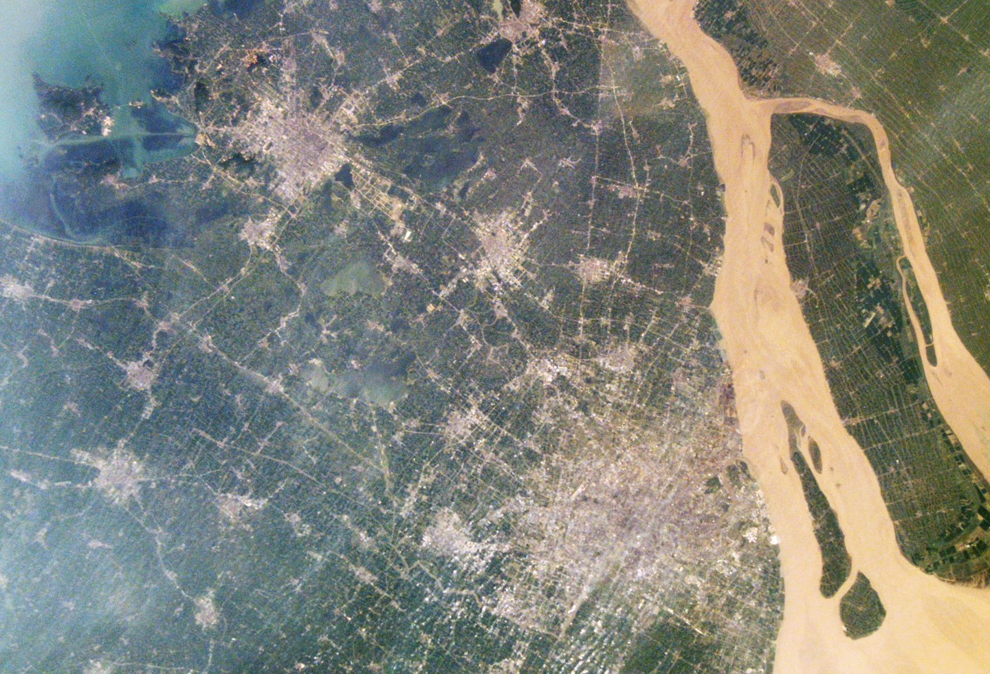 Many of China’s cities have grown at tremendous rates, but comparison between a 2012 night time image (above, top) and 2002 day time image (above, lower) taken from the International Space Station provides an indication of how much development has occurred in the Shanghai region over the past 10 years. The official census count in 2000 was 16.4 million; the city population has increased more than 35% since that time. Much of the growth has occurred in new satellite developments like areas to the west of the city (for example, Suzhou).