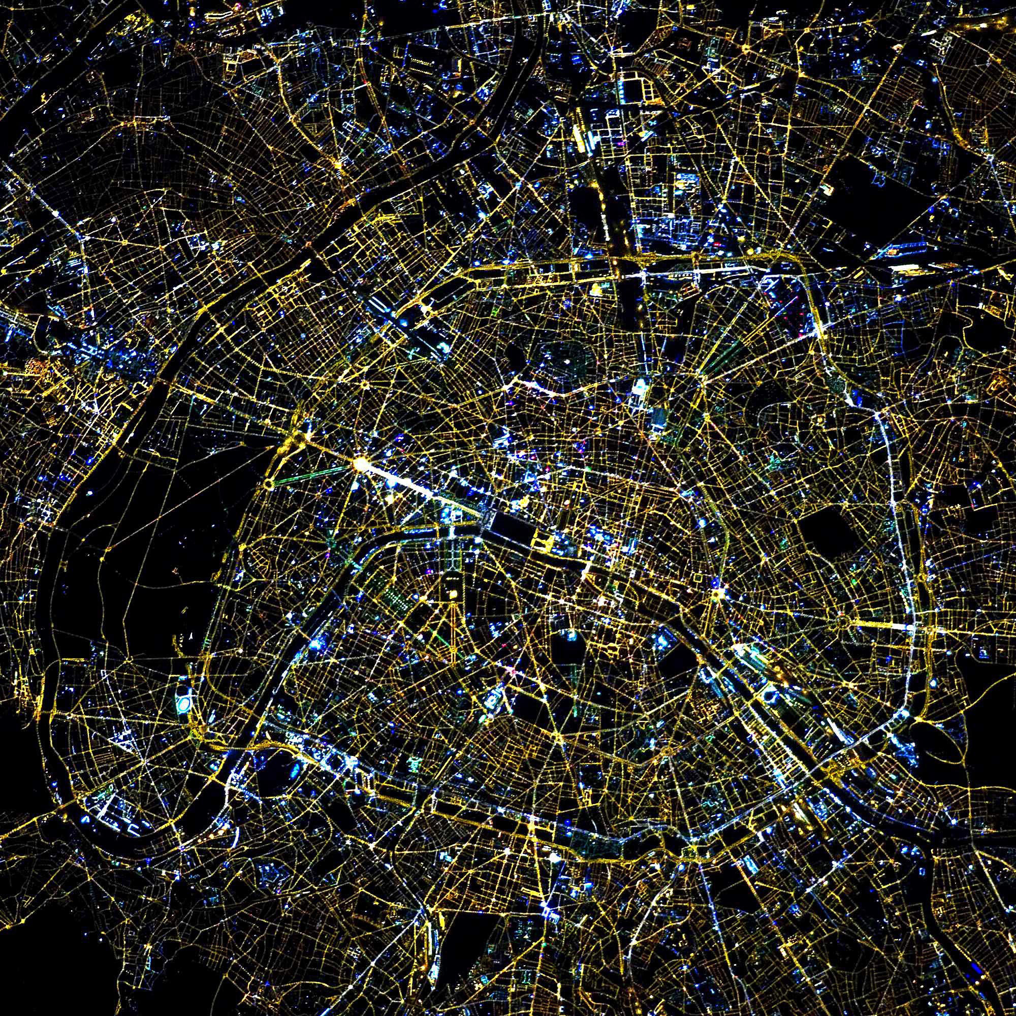 The montage above shows 18 cities—from London to Singapore to Phoenix—with especially diverse nighttime lightscapes. The images are also relatively high in resolution: Each was shot with a 400-millimeter lens capable of resolving individual lights. Small then calibrated each of the images to have the same color temperature, so they could be compared directly. This montage was calibrated to 5500 Kelvin—about the same color temperature as sunlight.