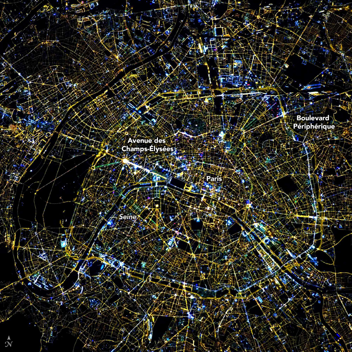 Astronaut photograph ISS032-E-17635 (Kuwait City) was acquired on August 9, 2012, with a Nikon D4 digital camera using a 400 millimeter lens. The image was taken by a member of the Expedition 32 crew . Astronaut photograph ISS043-E-93480 (Paris) was acquired on April 8, 2015, with a Nikon D4 digital camera using a 400 millimeter lens. The image was taken by a member of the Expedition 43 crew . The images have been cropped, calibrated to common tint and white balance, and corrected for wavelength-dependent atmospheric transmission losses. Both photos were provided by the ISS Crew Earth Observations Facility and the Earth Science and Remote Sensing Unit, Johnson Space Center. Additional images taken by astronauts and cosmonauts can be viewed at the NASA/JSC Gateway to Astronaut Photography of Earth . Story by Kathryn Hansen .
