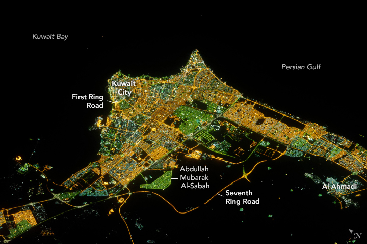 In Kuwait City and surrounding neighborhoods, lighting in newer developments such as Abdullah Mubarak Al-Sabah appears green—likely mercury vapor streetlights. The brighter lights, surrounded by dimmer, more uniformly disibuted lights, are probably mosques.