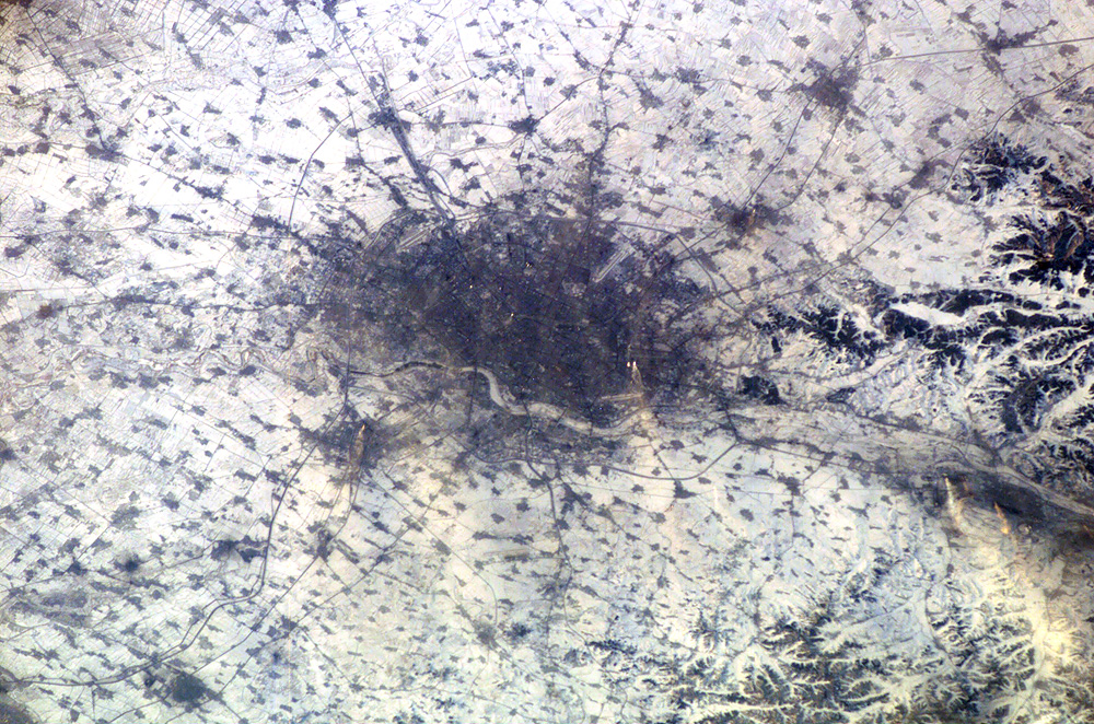 Shenyang’s role as a major industrial center is illustrated by this astronaut photograph. Snow cover provides a clear contrast between urbanized (dark grey, center of image) and rural regions (white to light grey). The major portion of the local economy is devoted to industries such as metal smelting, coal mining, and petrochemical processing. Several southeast-trending plumes from industrial facilities are visible in the image. The high density of industrial land use in the Shenyang metropolitan area has lead to significant air, water, and soil pollution in the region. Recently, several initiatives to reduce pollution levels and establish environmentally sound development guidelines have begun with support from local government and the United Nations.