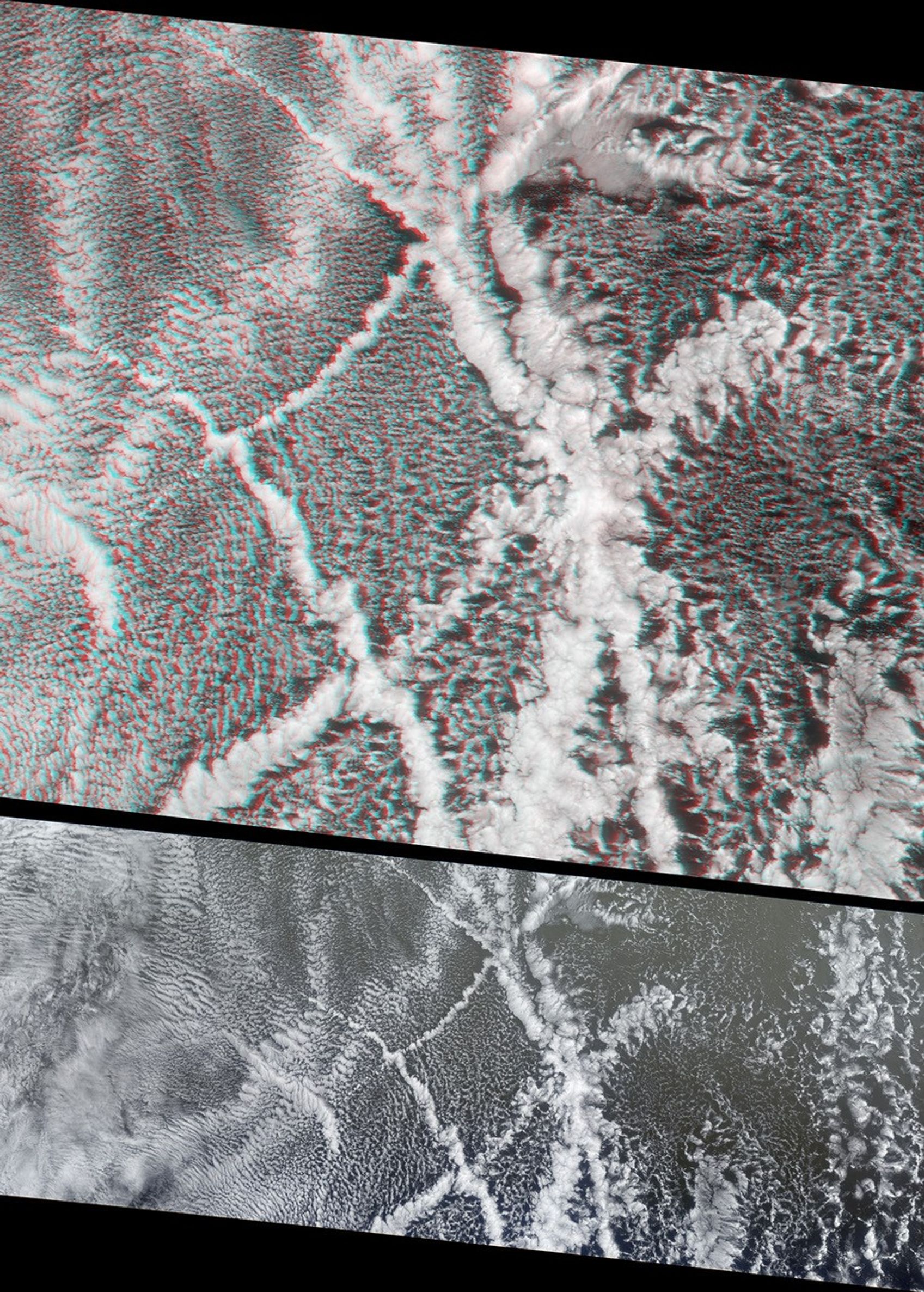 These images are centered over the Pacific Ocean, about 1600kilometers west of San Francisco, and were captured by the Multi-angleImaging SpectroRadiometer on July 18, 2001. The top panel features astereo anaglyph view and represents an area of about 400 kilometers x465 kilometers. The panel below it is a natural-color nadir (vertical)view of a somewhat longer section about 935 kilometers in extent. Thestereo anaglyph enables a three-dimensional visualization of thevertical structure of the condensation trails. It was created using acombination of red band data from MISR’s 70-degree forward and70-degree backward-viewing cameras. The images have been oriented withnorth at the left and west at the bottom to facilitate stereo viewing.In order to observe the 3-D effect of the stereo anaglyph, red/blueglasses should be used with the red filter placed over your left eye.Information on ordering glasses can be found at http://photojournal.jpl.nasa.gov/Help/VendorList.html#Glasses.