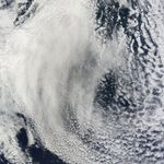 This pair of images demonstrates how air pollution can change the size of droplets in marine clouds. The top image is a photo-like view of the North Pacific Ocean (south of the Aleutian Islands) on September 29, 2009. A blanket of clouds—a little thin in places—spans the scene. The lower image shows the size of cloud droplets within the area outlined in white in the top image. Bigger droplets are darker colors (blue, purple); smaller droplets are brighter (pink, yellow).