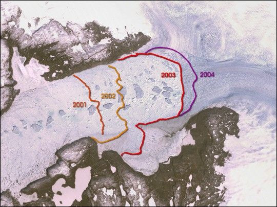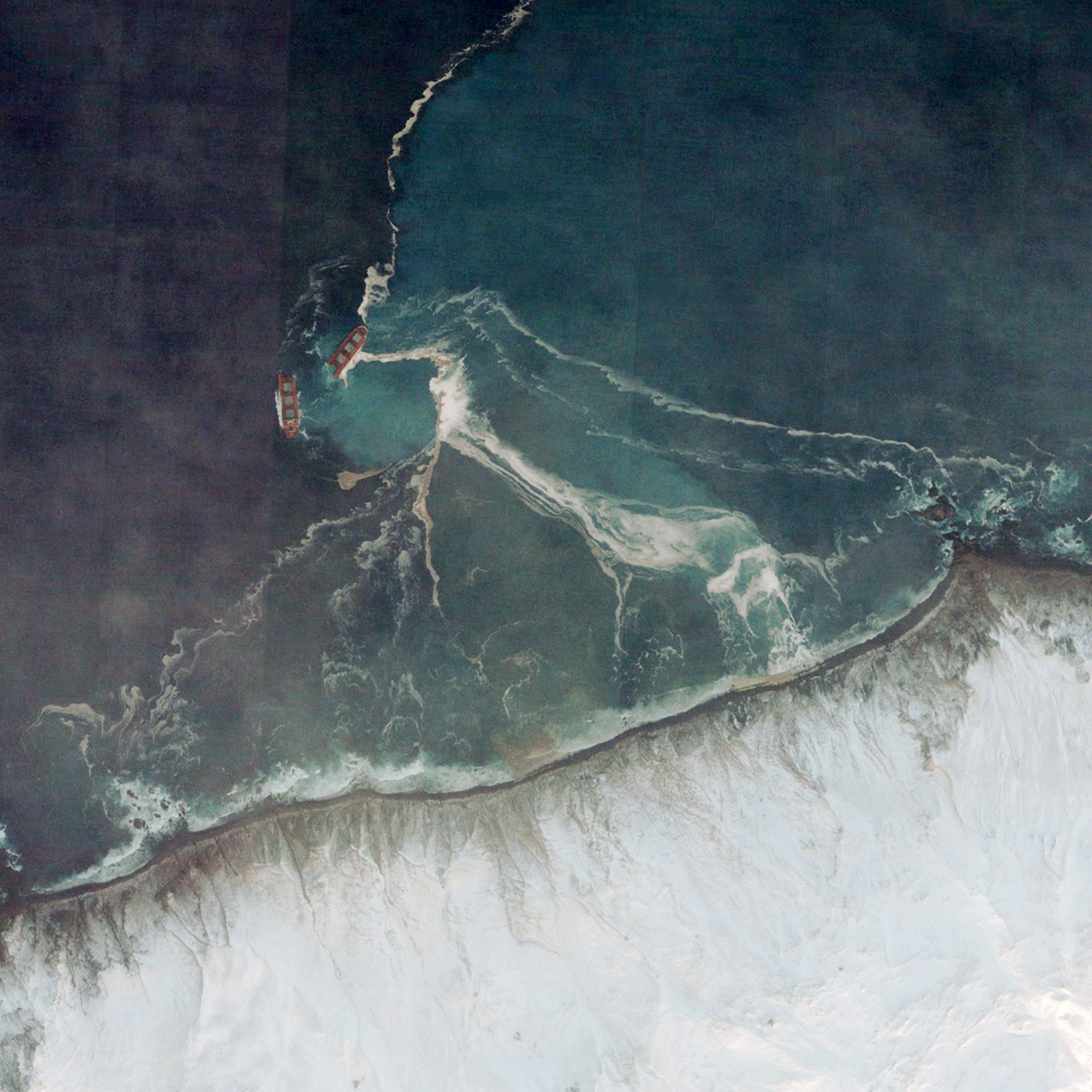 On Wednesday, December 8, 2004, the Selendang Ayu ran aground near Skan Bay off Alaska’s Unalaska Island. The ship snapped in two and spilled an estimated 41,000 gallons of oil into the ocean. This image of the wrecked freighter was captured by the QuickBird satellite on December 13, 2004. The ship is anchored in shallow waters near the shore and has been hammered with waves from the deeper ocean to its left. The lighter blue pool to the right of the ship is probably a reflection of the shallow sea floor.