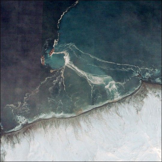 The oil spill is reported to extend over 10 miles of remote coast near the Alaska Maritime National Wildlife Refuge on Unalaska Island. The tan streaks flowing from the top half of the ship toward the image top and right may be congealing bunker fuel. Weather has slowed rescue and clean-up operations, and the foamy white waves make the ocean appear rough in this image. It is also possible that the long white line between the ship and the shore is formed by soybeans spilled from the ship’s hold.