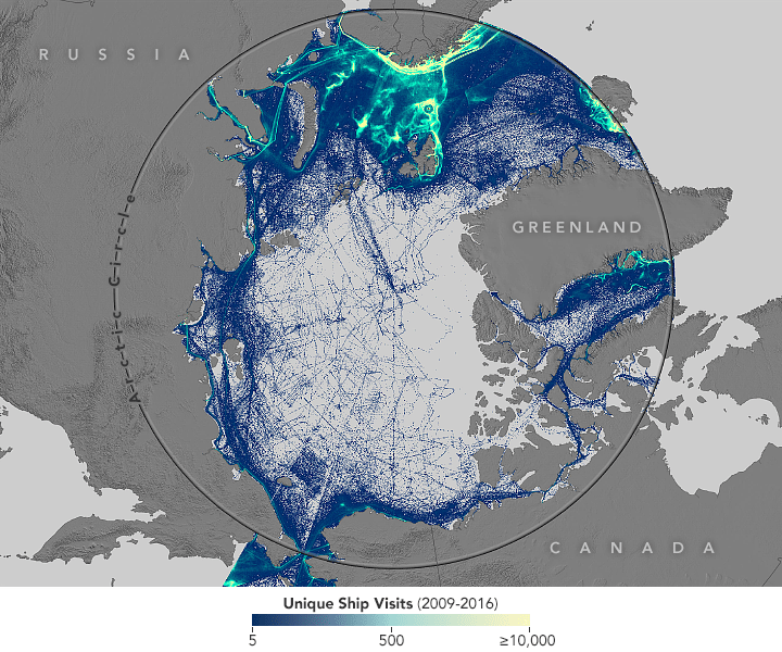 NASA Earth Observatory images (sea ice concentration and extent) by Joshua Stevens, using data from the National Snow and Ice Data Center . Ship traffic map provided by Greg Fiske, Woods Hole Research Center . Funding for the ship traffic analyses is provided by the National Science Foundation (NSF-OPP 1263819 and NSF-ICER 1660449). Story by Mike Carlowicz.
