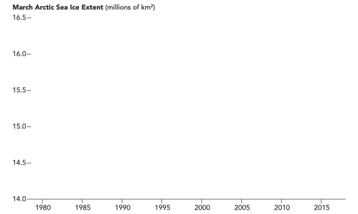The map above shows the average concentration of Arctic sea ice on March 17, 2018, when it reached the annual maximum. All white-shaded areas had an ice concentration of at least 15 percent (the minimum at which satellites give a reliable measurement), and span a total area that scientists refer to as the “ice extent.” Ice cover peaked at 14.48 million square kilometers (5.59 million square miles), the second lowest maximum on record and 1.16 million square kilometers (448,000 square miles) below the 1981 to 2010 average. The animated line plot below shows Arctic sea ice extent in every March since 1979.