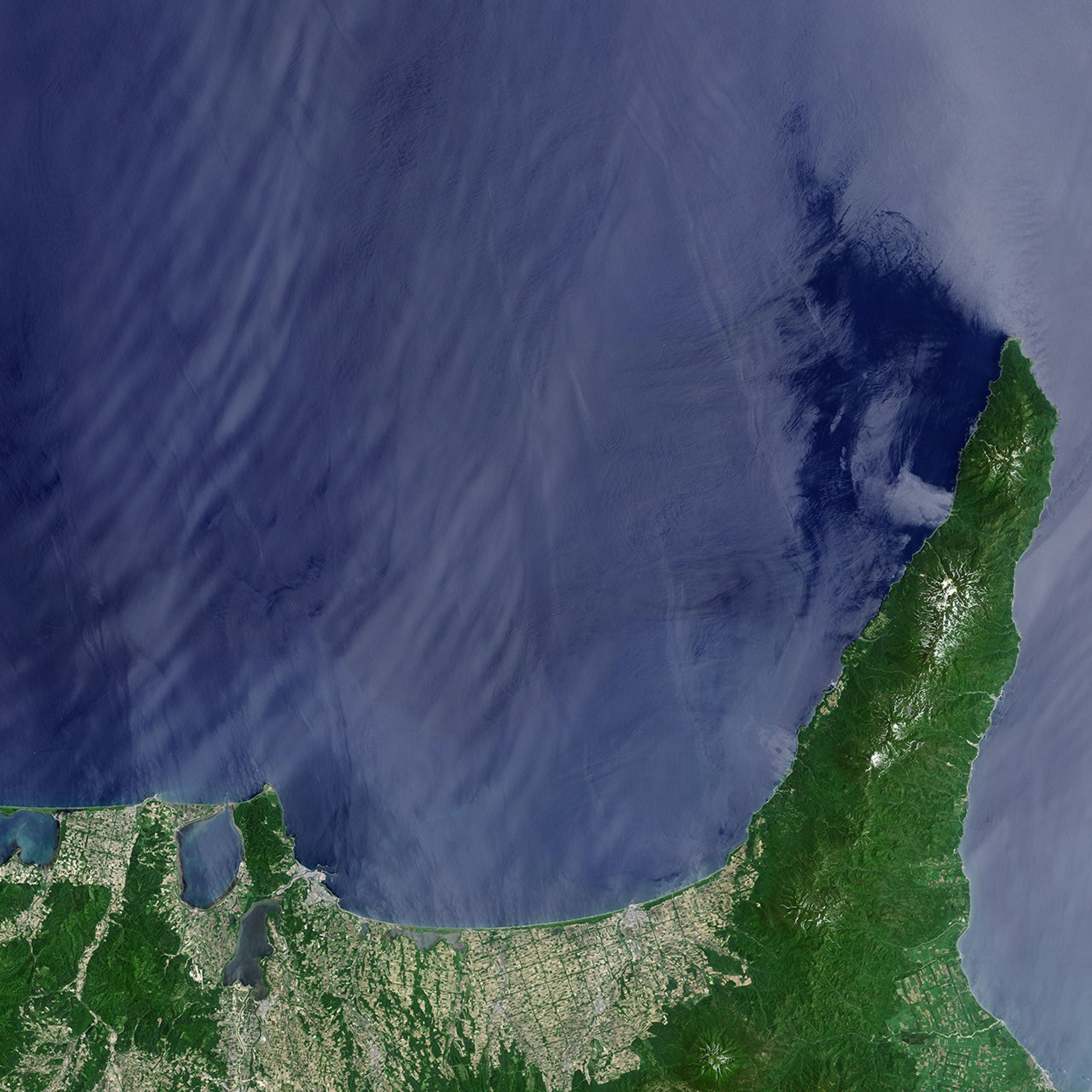 This image from the Landsat 7 satellite on June 20, 2000, shows the Shiretoko Peninsula, the surrounding Sea of Okhotsk, as well as a bit of the city of Shari at the bottom, left of center. The tan and green grid pattern of the city suggests developed areas crisscrossed with tree-lined streets. Compared to the city, the Shiretoko World Heritage Site is amazingly lush, with largely unbroken forest spanning the peninsula like an emerald blanket. Even on the precipice of summer, snow dusts high mountain peaks. Roughly the northern quarter of the peninsula is roadless, and minimal human influence in the area has allowed wildlife to thrive.