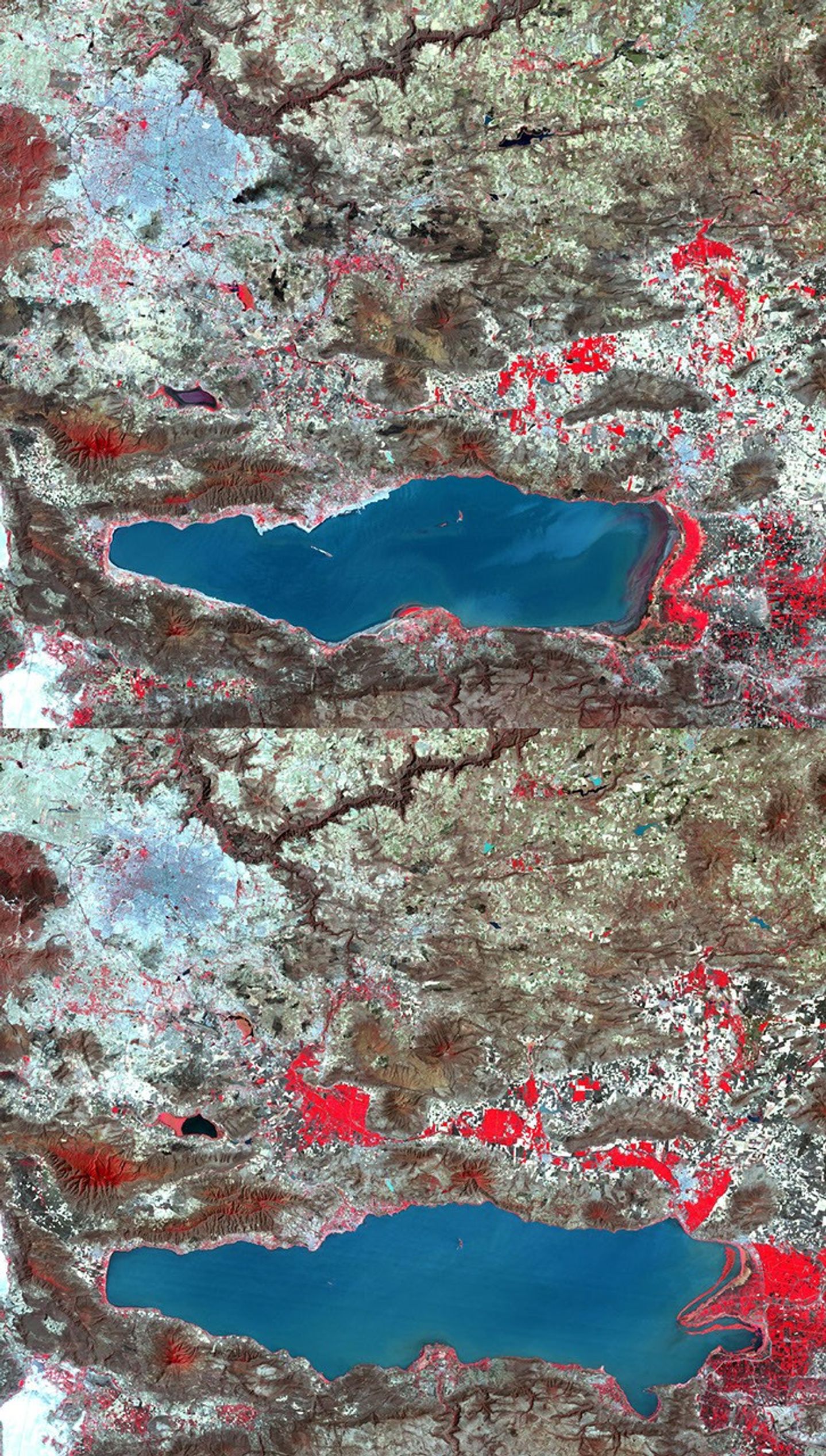 The false color composite images shown here were produced from multi-spectral data acquired by the Landsat 5 Thematic Mapper (1986) and the Landsat 7 Enhanced Thematic Mapper (2001). This text was provided by Kathryn Mauz (University of Arizona) with contributions from Justus Hauser (Sociedad Amigos del Lago de Chapala) and Salvador Peniche-Camps (Universidad de Guadalajara).