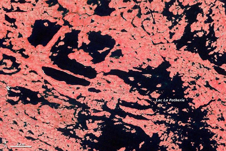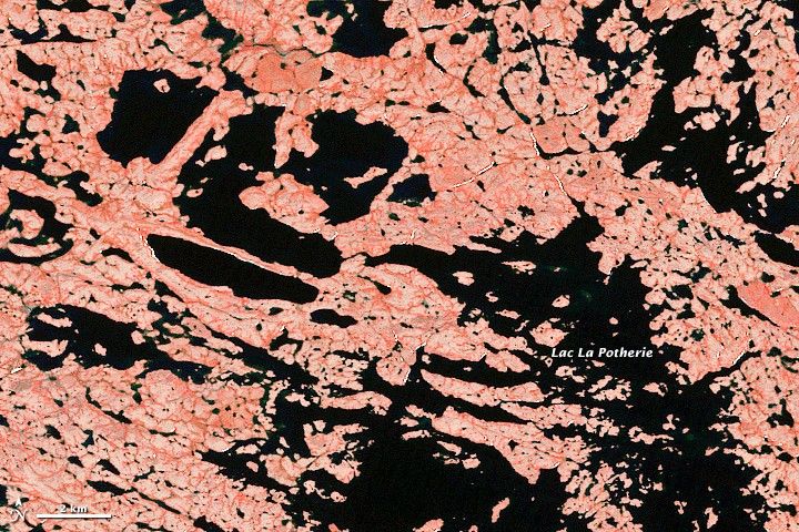 The Thematic Mapper on Landsat 5 captured the false-color images (above) of a study area around Lac La Potherie in Canada in July 1986 and July 2004. The images were made with a combination of near-infrared, red, and green light to bring out details in vegetation. The deeper the red color in the image, the denser the vegetation.