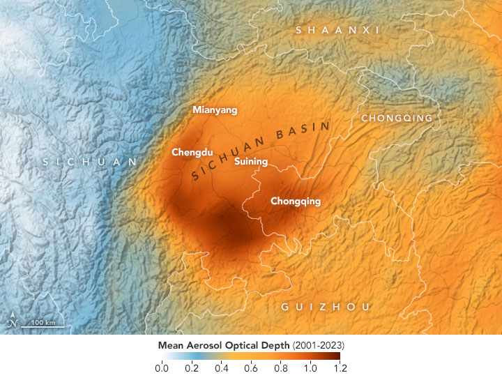 MODIS has made daily observations of the Sichuan Basin for more than two decades, allowing atmospheric scientists to map the spatial distribution of haze over the Sichuan Basin over time. One research team from the Nanjing University of Information Science and Technology analyzed all available MODIS data and found that haze tended to be thickest in the southern part of the basin around the large cities of Chengdu and Chongqing. Air was typically a bit cleaner in the northern part of the basin because the mountains enclosing that part of the basin are smaller and allow winds to circulate more easily.