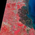 In the image acquired in August 2004, almost two years before the eruption started, crops appear as a patchwork of red and pale blue or pale green. Between the agricultural fields, settlements resemble multicolored grains of sand. In the east, shrimp farms vaguely mimic the patterns of the agricultural fields, but water colors them black.