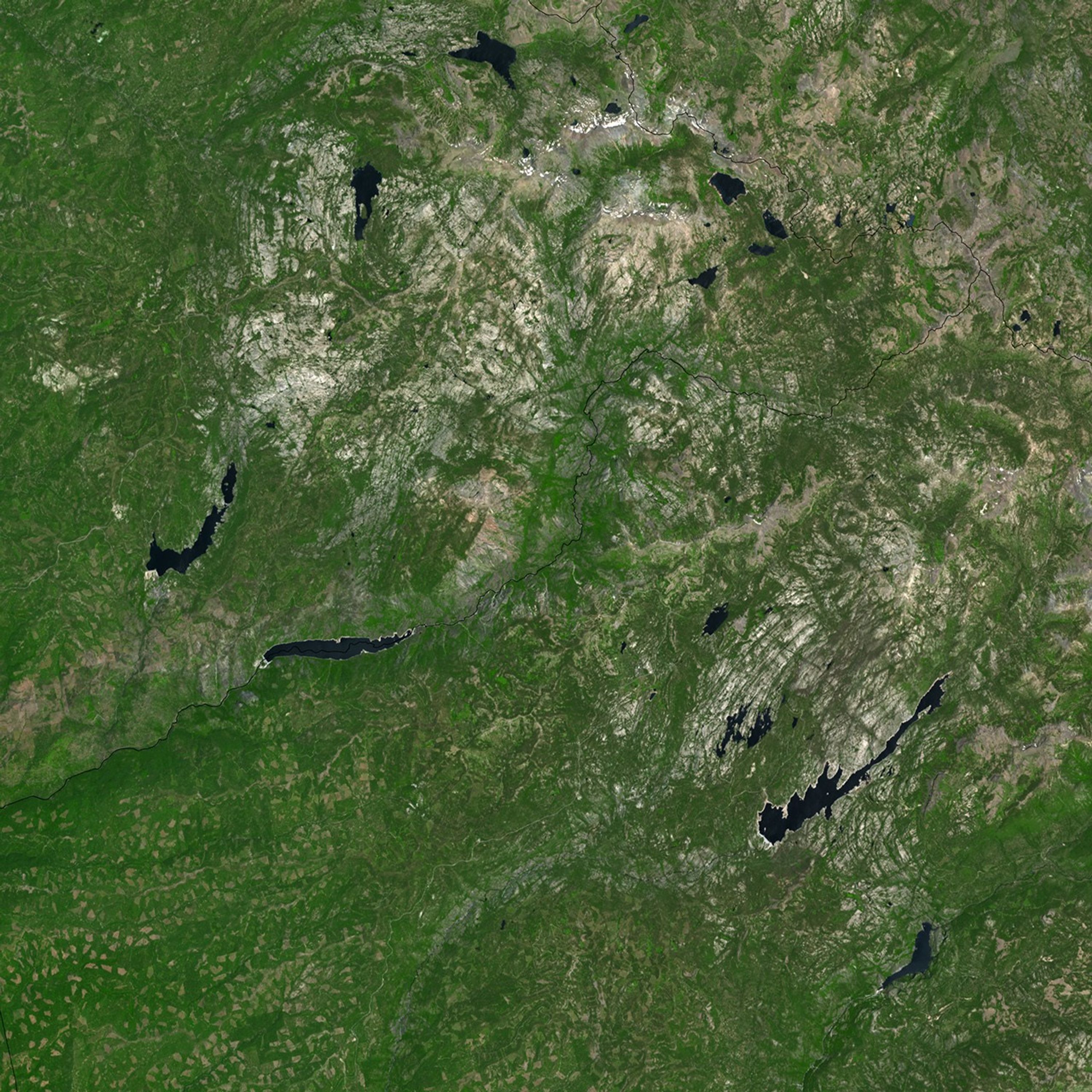 The terrain in the area is rugged, with steep mountain crags interspersed with occasional lakes with jagged contours. At high elevations, forests give way to alpine plants, and finally, to bare rock. A pale shoreline outlines Spicer Reservoir, near the bottom of the image, suggesting a dip in the lake’s water level, consistent with warm, dry conditions that predominated in the American West in the early summer of 2007.