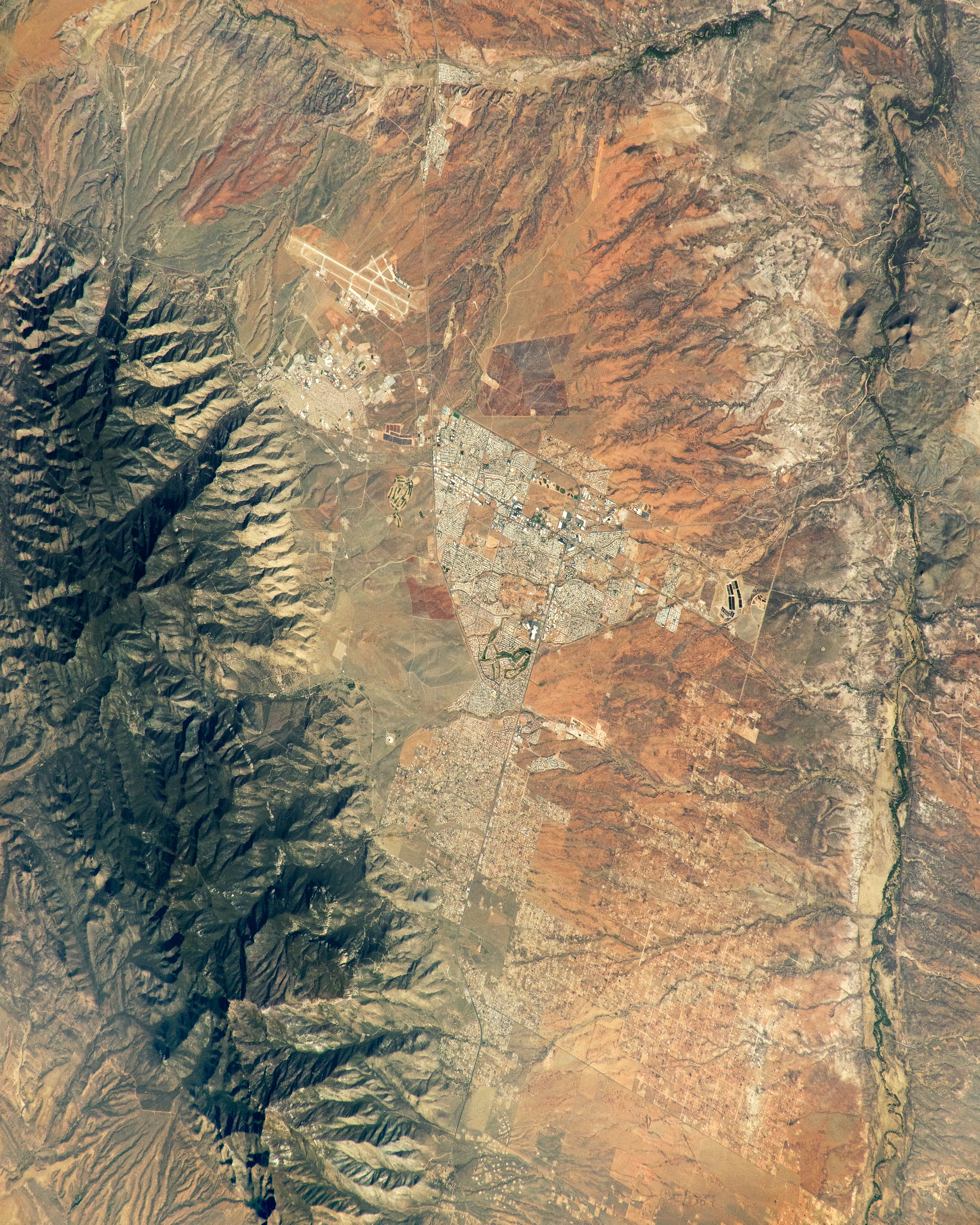 An astronaut aboard the International Space Station took this photograph of Sierra Vista in southern Arizona, just north of the United States-Mexico border. Bounded on all sides by military land (Fort Huachuca), national forest, and conservation areas, Sierra Vista’s city area is structured in a triangular shape. Creeks and washes sprawl across the desert flats from the Huachuca Mountains to the San Pedro River.