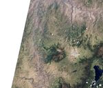 For comparison, the second image shows roughly the same area in natural color on a rare cloud-free day in 2002, as observed by the Enhanced Thematic Mapper Plus (ETM+) on the Landsat 7 satellite. (The resolution of Landsat 7 is 30 meters per pixel.) Note how the UAVSAR image gives more sense of the three-dimensional structure and slope of the land.