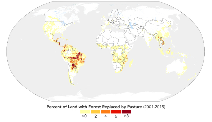 The map above shows forests being cleared for cattle all over the world, but particularly in Brazil, where deforestation has been on the rise. Large tracts of forest have also been cleared in Paraguay, Bolivia, and Peru according to WRI data.