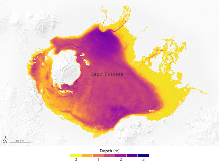 The map above shows the bathymetry of Bolivia’s Lago Coipasa during the wet season. Located in the Altiplano, Coipasa is an ephemeral saline lake with a maximum depth around 3.5 meters (11 feet). The lake is a popular tourist spot and adjacent to a large salt flat, where evaporation of mineral-rich waters leads to the formation of thick, flat salt deposits. The lake was previously unmapped.