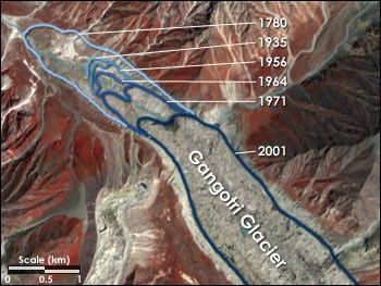 This composite ASTER image shows how the Gangotri Glacier terminus has retracted since 1780. Contour lines are approximate.