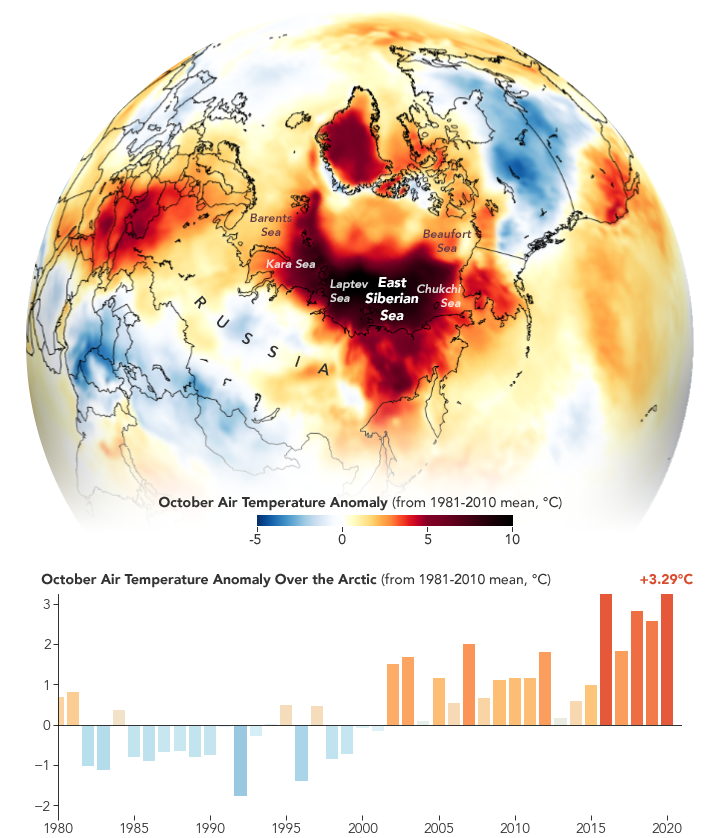 But it was the early ice retreat amid warm Arctic air temperatures that set the stage for the slow freeze-up in 2020. Starting in May, warm air over Siberia provoked rapid melting in the East Siberian and Laptev Seas. With large expanses of dark, ice-free water exposed to the warming sunlight, the ocean could gain more heat than usual over the course of the summer, which reinforced melting. Until that heat escaped to the atmosphere, sea ice could not reform.
