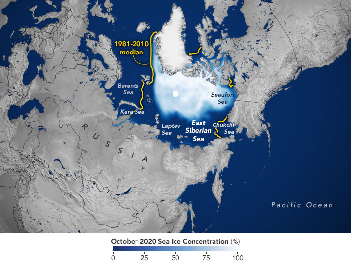 The low ice conditions are also apparent in the map above, which shows the average sea ice extent—defined as the total area in which the ice concentration is at least 15 percent—for October 2020. The ice extent (white) on that day measured 5.28 million square kilometers (2.04 million square miles). That’s 3.07 million square kilometers (1.19 million square miles) lower than the 1981-2010 average extent for the same month (yellow line).