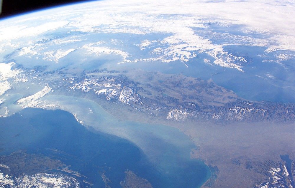 The floor of the Po River valley, lower right, is obscured by haze. Experience gained from similar haze events, in which atmospheric pressure, humidity and visibility and atmospheric chemistry were known, suggests that the haze is industrial smog. Industrial haze from the urban region of the central and upper Po valley accumulates to visible concentrations under conditions of high atmospheric pressure and the surrounding mountains prevent easy dispersal. This view illustrates the markedly different color and texture of cloud versus industrial aerosol haze.