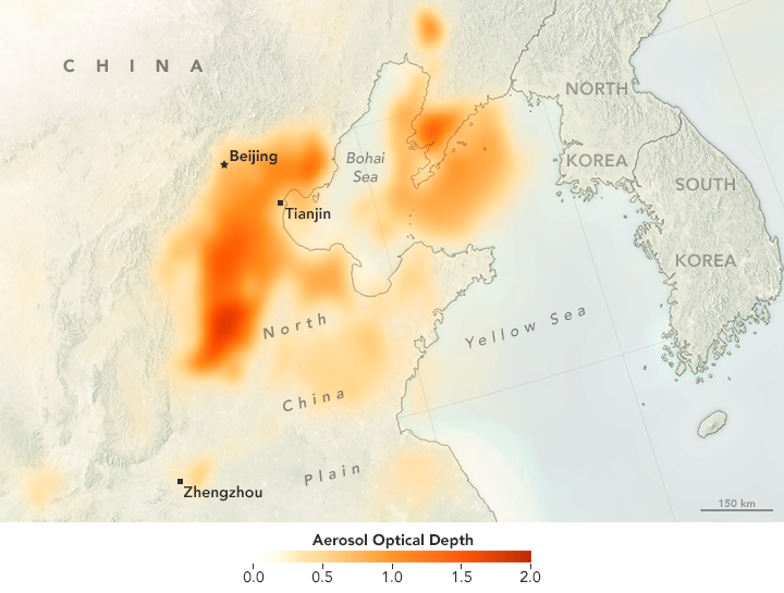 While smog regularly occurs in China, the extent of this event stands out. In a record-breaking air pollution event in January 2013, ground-based sensors at the U.S. Embassy in Beijing reported PM2.5 measurements of 291 micrograms per cubic meter of air. The December 2016 smog is comparable to January 2013, said Andrew Sayer, an atmospheric scientist working for Universities Space Research Association at NASA’ Goddard Space Flight Center.