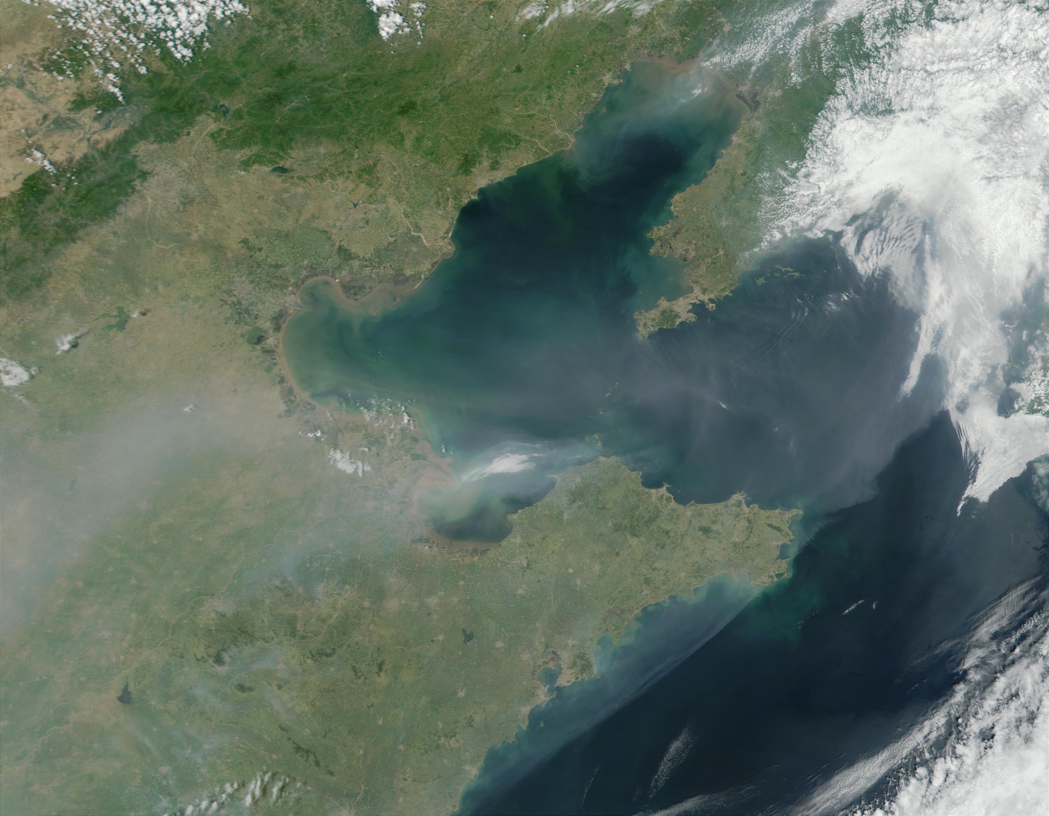 There appears to be a phytoplankton bloom (greenish pixels) off the northern shore of Bo Hai Bay. The brownish pixels in the northeastern corner of the bay, and all along the western shore, are sediment run-off from the land.