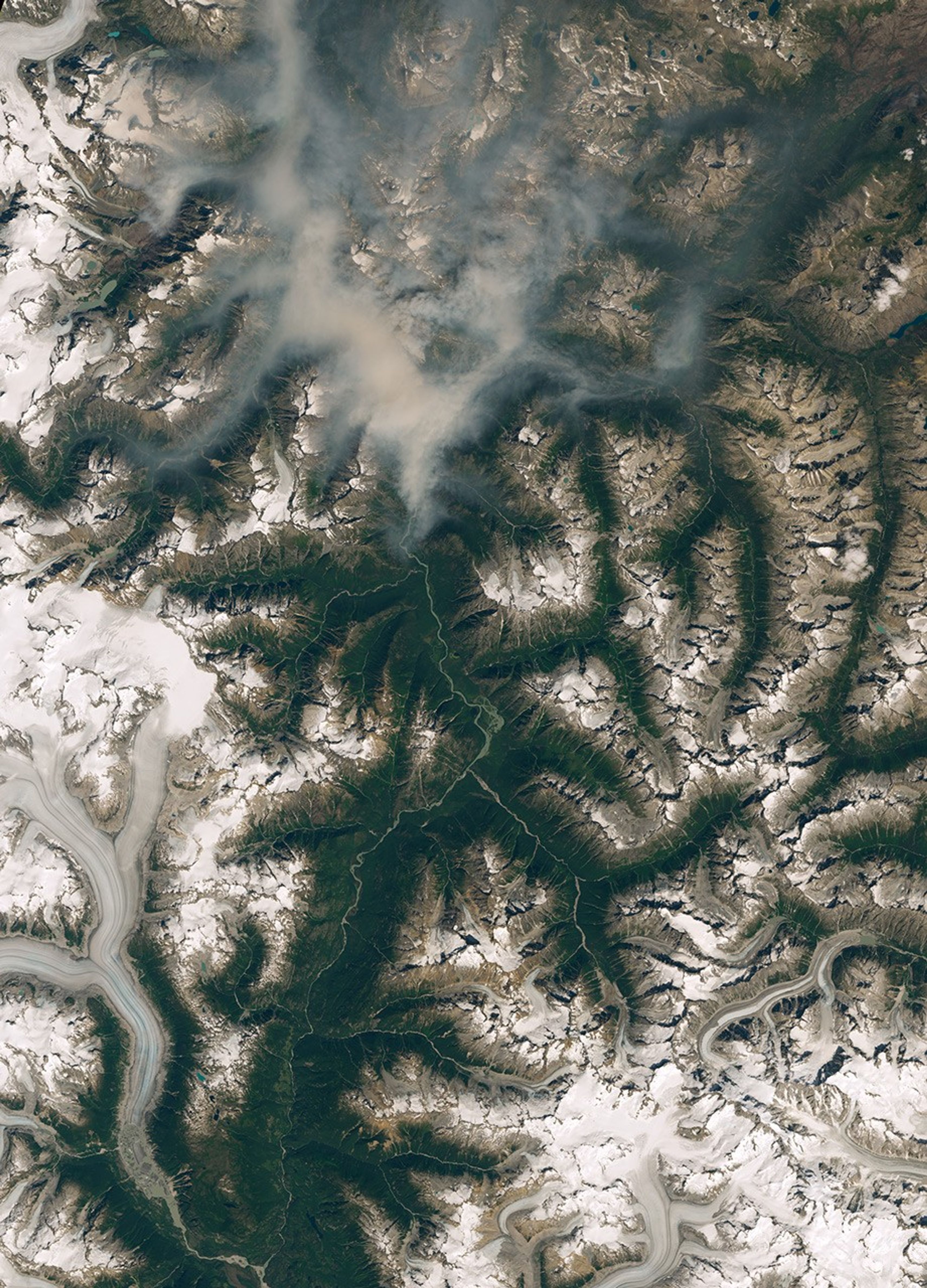 The Operational Land Imager (OLI) on Landsat 8 captured this natural-color image of smoke lingering in valleys near the snow-capped peaks of the Coast Mountains on August 7, 2018.