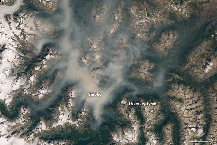 The Operational Land Imager (OLI) on Landsat 8 captured this natural-color image of smoke lingering in valleys near the snow-capped peaks of the Coast Mountains on August 7, 2018.