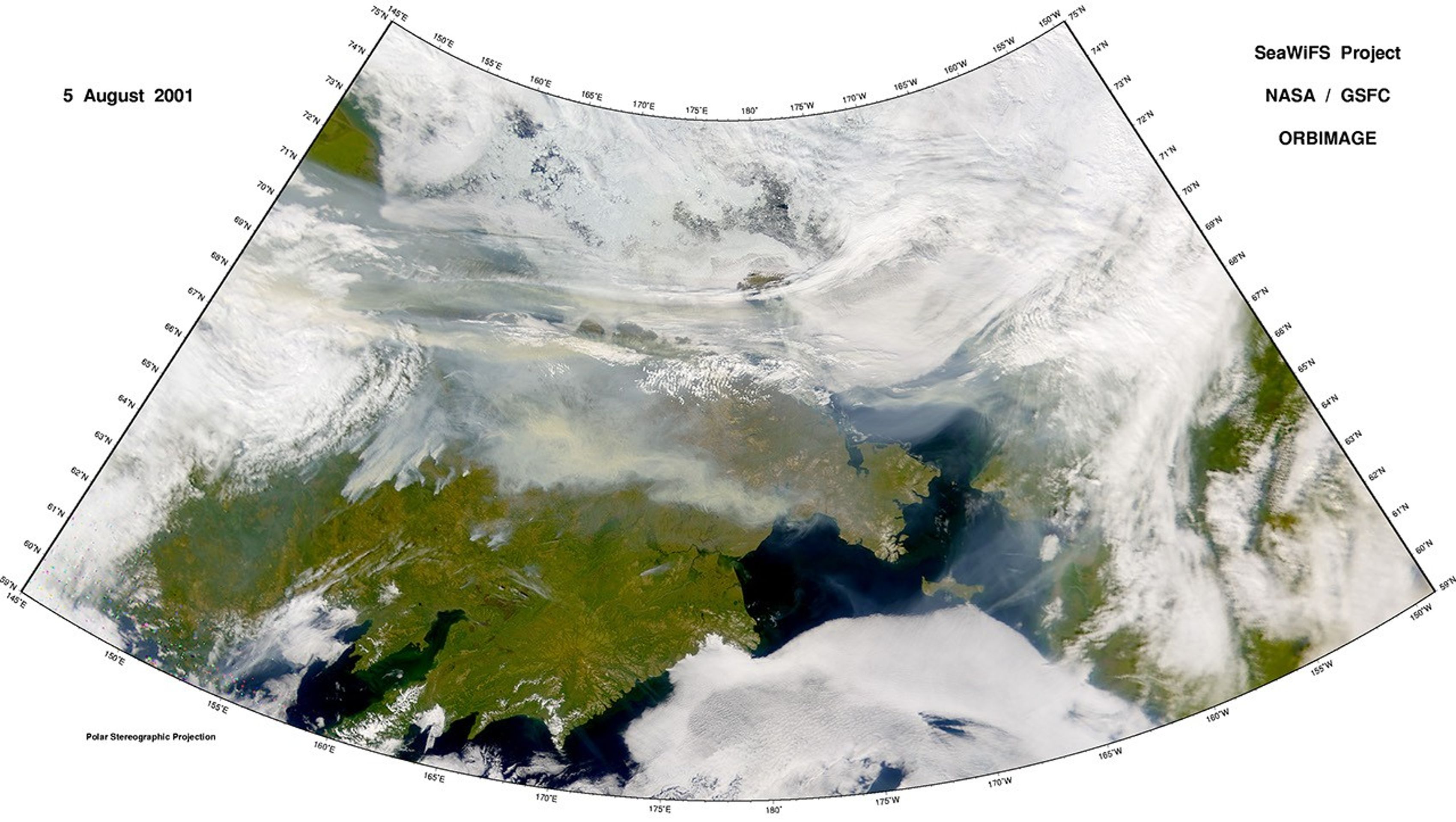 A large number of forest fires in Siberia are emitting vast pall of smoke that is spreading from the interior of Asia to Alaska and the Pacific Northwest. So far this summer, tens of thousands of acres have burned in Siberia’s boreal forests. The image above, taken by the Sea-viewing Wide Field-of-view Sensor (SeaWiFS) on August 5, 2001, shows smoke from the fires (left) spreading across northeastern Russia, and over the Bering Strait and Alaska. A later image, also acquired by SeaWiFs, showed haze which probably originated from these fires off the coast of British Columbia and Washington State.