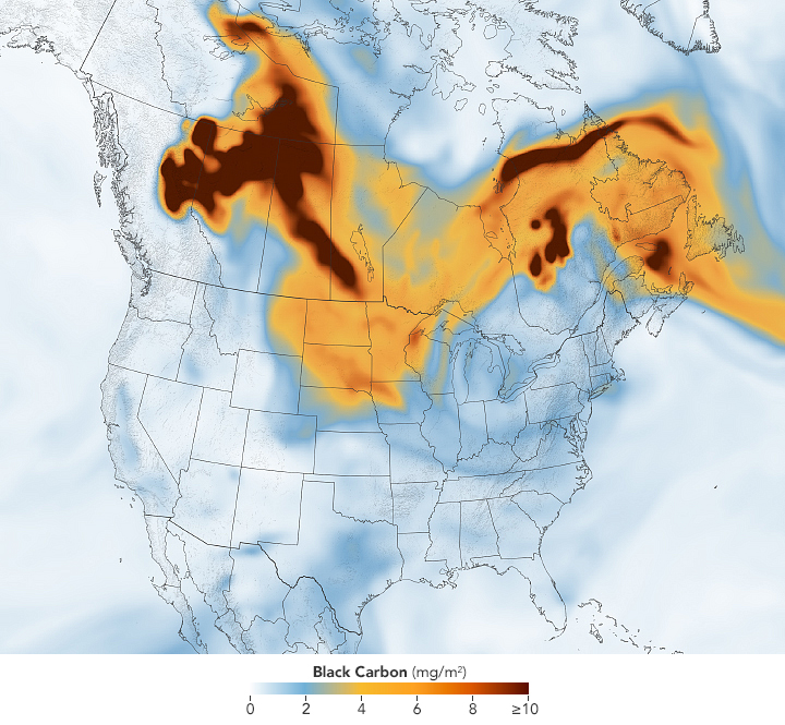 The image below highlights the density of black carbon particles—commonly called soot—in the smoke as it moved across North America. The black carbon data come from NASA’s GEOS forward processing (GEOS-FP) model, which assimilates data from satellite, aircraft, and ground-based observing systems. In addition to making use of satellite observations of aerosols and fires, GEOS-FP incorporates meteorological data like air temperature, moisture, and winds to project the plume’s behavior. The fine particulate matter (PM2.5) in this pollution can enter the lungs and lead to health problems.
