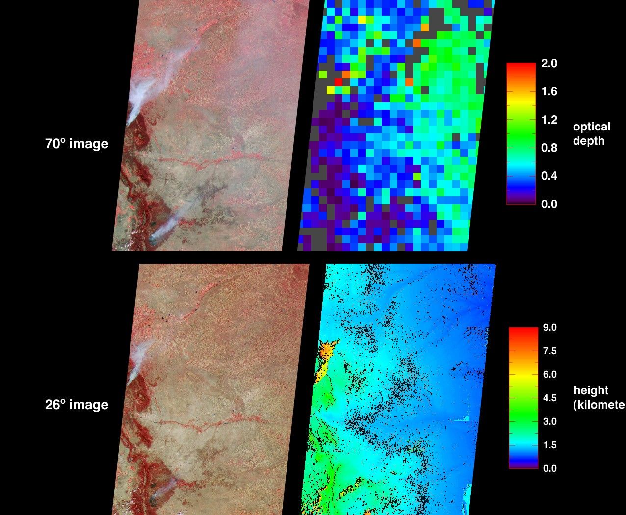 The image at top-left was acquired by MISR’s most oblique (70-degree)forward-viewing camera, and the view at bottom-left was captured by MISR’s26-degree forward-viewing camera. Both left-hand panels are "false color" views,utilizing near-infrared, red, and blue spectral bands displayed as red, greenand blue respectively. With this spectral combination, highly vegetated areasappear red. At top right is a map of aerosol optical depth. This map utilizesthe capability of the oblique view angles to measure the abundance of particlesin the atmosphere. Haze distributed across the eastern part of the state isindicated by a large number of green pixels, and areas where no retrievaloccurred are shown in dark grey. The more oblique perspective utilized withinthe top panels enhances the appearance of smoke and reveals the haze. In thelower left-hand panel the view is closer to nadir (downward-looking). Here thesmoke plumes appear more compact and the haze across eastern Colorado is notdetected. The lower right-hand panel is a stereoscopically derived height fieldthat echoes the compact shape of the smoke plumes in the near-nadir image.Results indicate that the smoke plumes reached altitudes of a few kilometersabove the surface terrain, or about the same height as the small clouds thatappear orange along the bottom edge to the left of center.