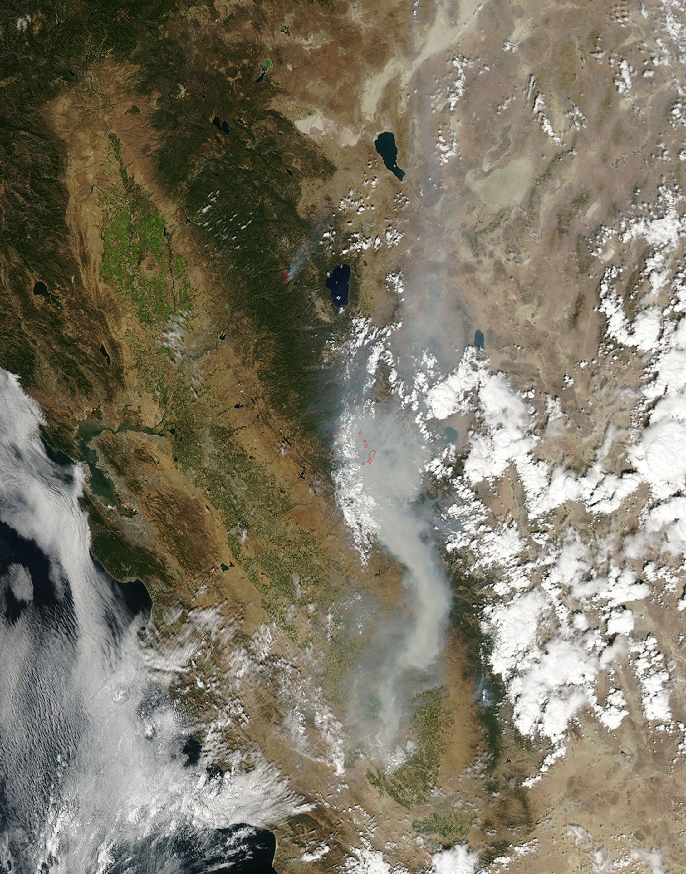 The Moderate Resolution Imaging Spectroradiometer (MODIS) on NASA’s Aqua satellite acquired this view of the fire on August 31, 2013. Red boxes outline the active fire areas. The smoke is brown and smooth in texture compared to the bright white clouds; it was thick enough at the time to entirely block the view of the ground from space.