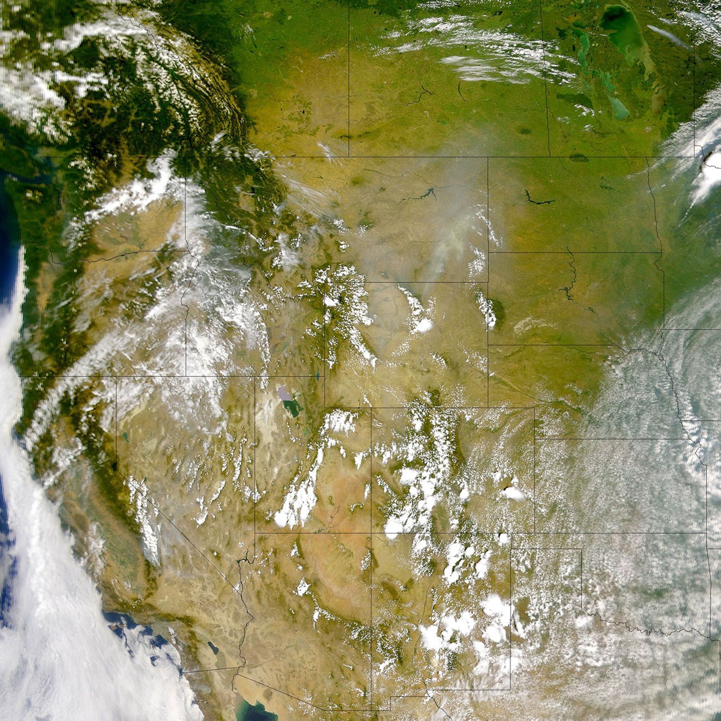California was not the only western state affected by fire during the last weekend of July. Parts of Montana and Wyoming were covered by a thick pall of smoke on July 30, 2000. This true-color image was captured by the Sea-viewing Wide Field-of-view Sensor (SeaWiFS). It is much easier to distinguishsmoke from cloud in the color SeaWiFS imagery than the black and white Geostationary Operational Environmental Satellite (GOES) imagery. However, GOES provides almost continuous coverage (animation of Sequoia National Forest fire) and has thermal infrared bands (Extensive Fires in the Western U.S.) which detect the heat from fires. On Monday July 31, 2000, eight fires covering 105,000 acres were burning in Montana, and three fires covering 12,000 acres were burning in Wyoming.