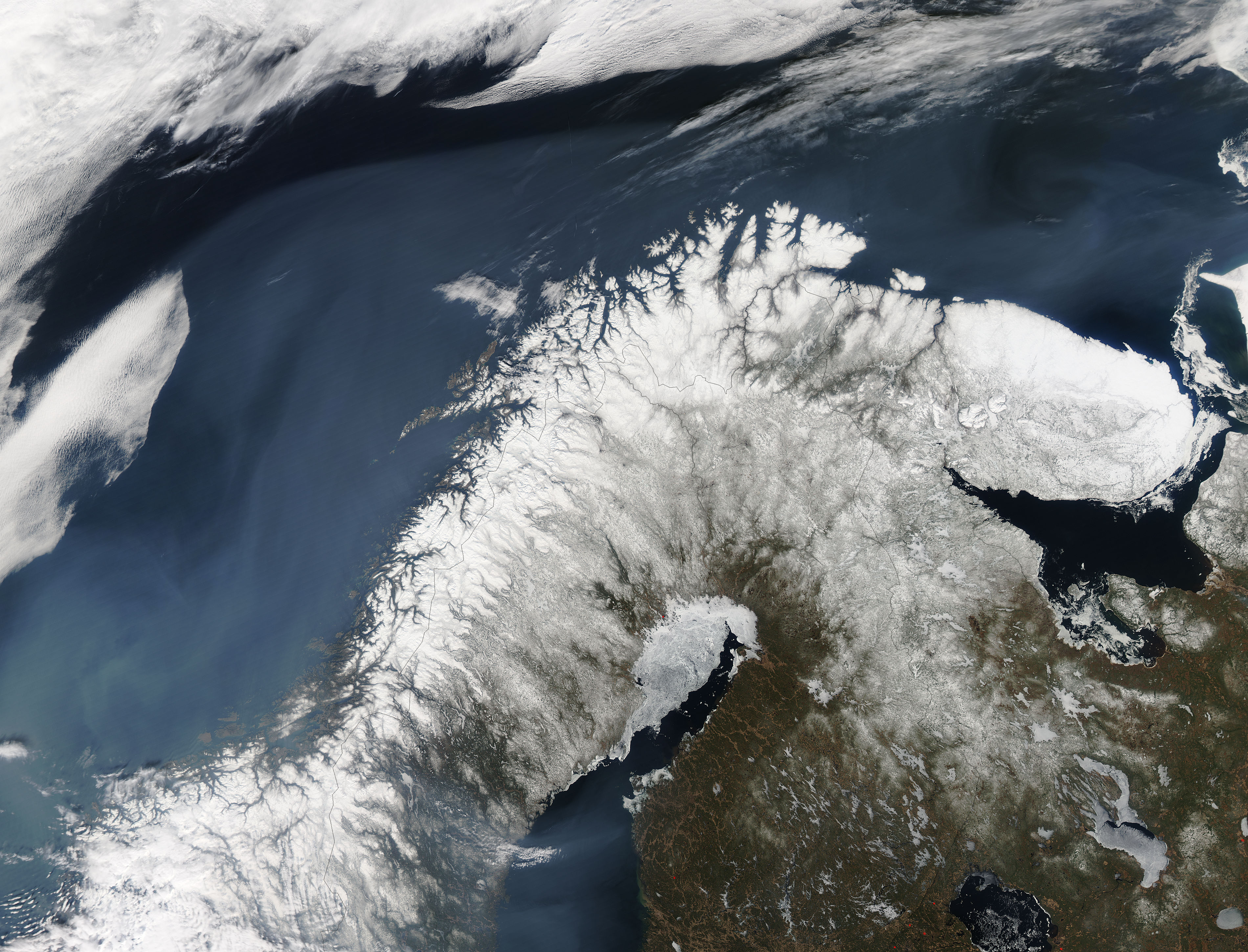 Spring agricultural fires were burning in western Russia throughout the end of April and early May 2006. The smoke from these fires has been spreading northward over Eastern Europe, Scandinavia, and out over the Barents Sea. This image from April 30, 2006, was captured by the Moderate Resolution Imaging Spectroradiometer (MODIS) on NASA’s Aqua satellite. Smoke casts a gray pall over the blue waters of the ocean.