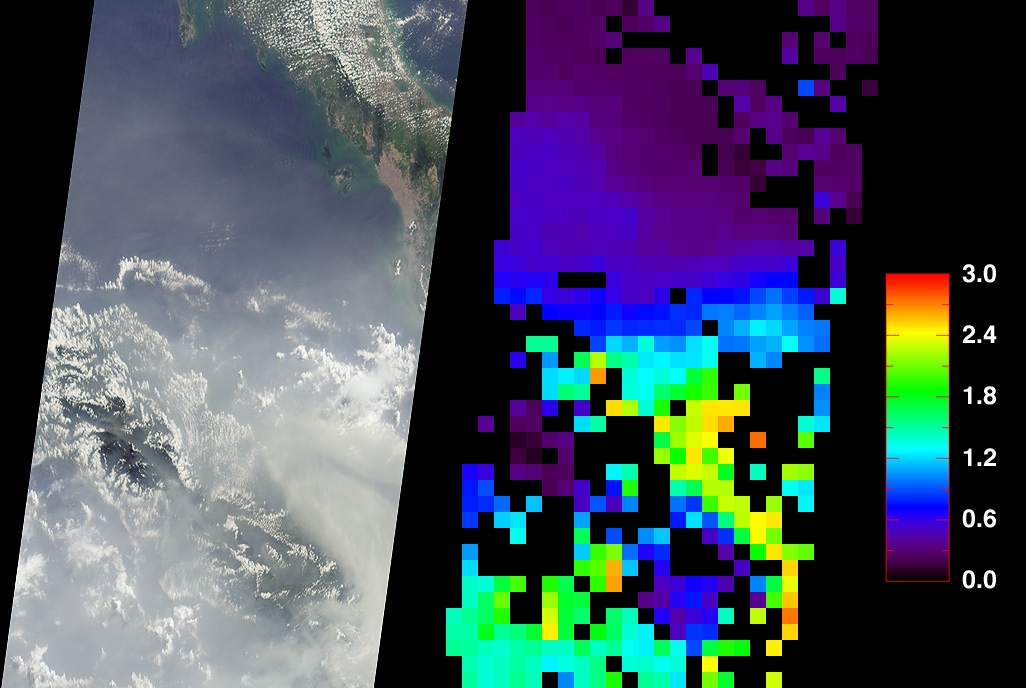 At least once a year for a period lasting from a week to several months,northern Sumatra is obscured by smoke and haze produced by agricultural burningand forest fires. These data products from the Multi-angle ImagingSpectroRadiometer (MISR) document the presence of airborne particulates on March 13,2002. On the left is an image acquired by MISR’s70-degree backward- viewing camera. On the right is a map of aerosol opticaldepth, a measure of the abundance of atmospheric particulates. This productutilized a test version of the MISR retrieval that incorporates an experimentalset of aerosol mixtures. The haze has completely obscured northeastern Sumatraand part of the Strait of Malacca, which separates Sumatra and the MalaysianPeninsula. A northward gradient is apparent as the haze dissipates in thedirection of the Malaysian landmass. Each panel covers an area of about 760kilometers x 400 kilometers.