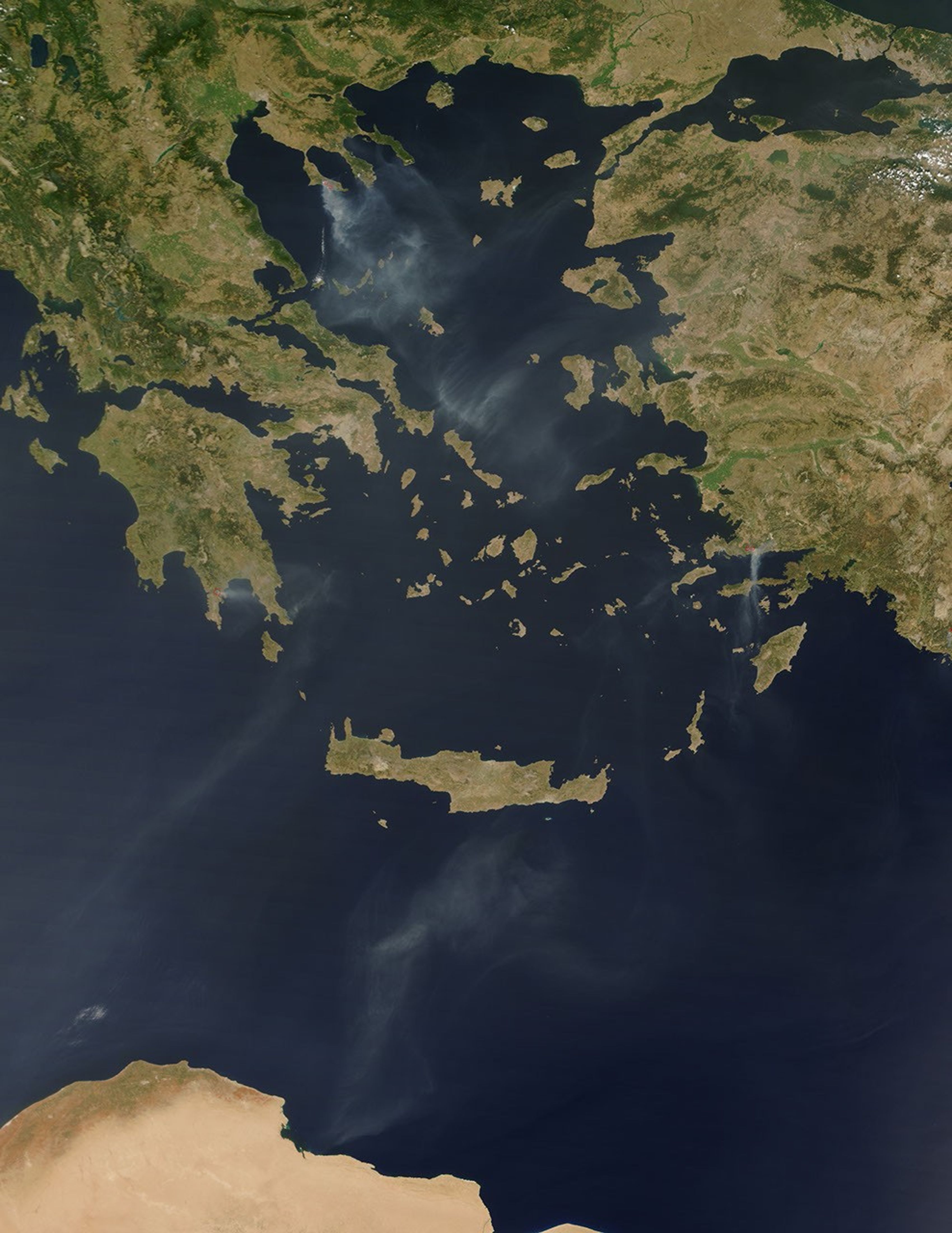 This image of the fire (location marked in red) was captured by the Moderate Resolution Imaging Spectroradiometer (MODIS) on NASA’s Terra satellite on August 22, 2006. Smoke spreads south and east over the Aegean Sea. The fire was burning on the westernmost of three small peninsulas that extend off the Halkidiki Peninsula, south of the city of Thessaloniki. Temperatures in the region have been high (42 degrees Celsius, or 107 degrees Fahrenheit), and a seasonal north wind fanned the fire. Other fires visible in the scene include one on the island of Peloponnisos, in southern Greece, and one in southwestern Turkey.