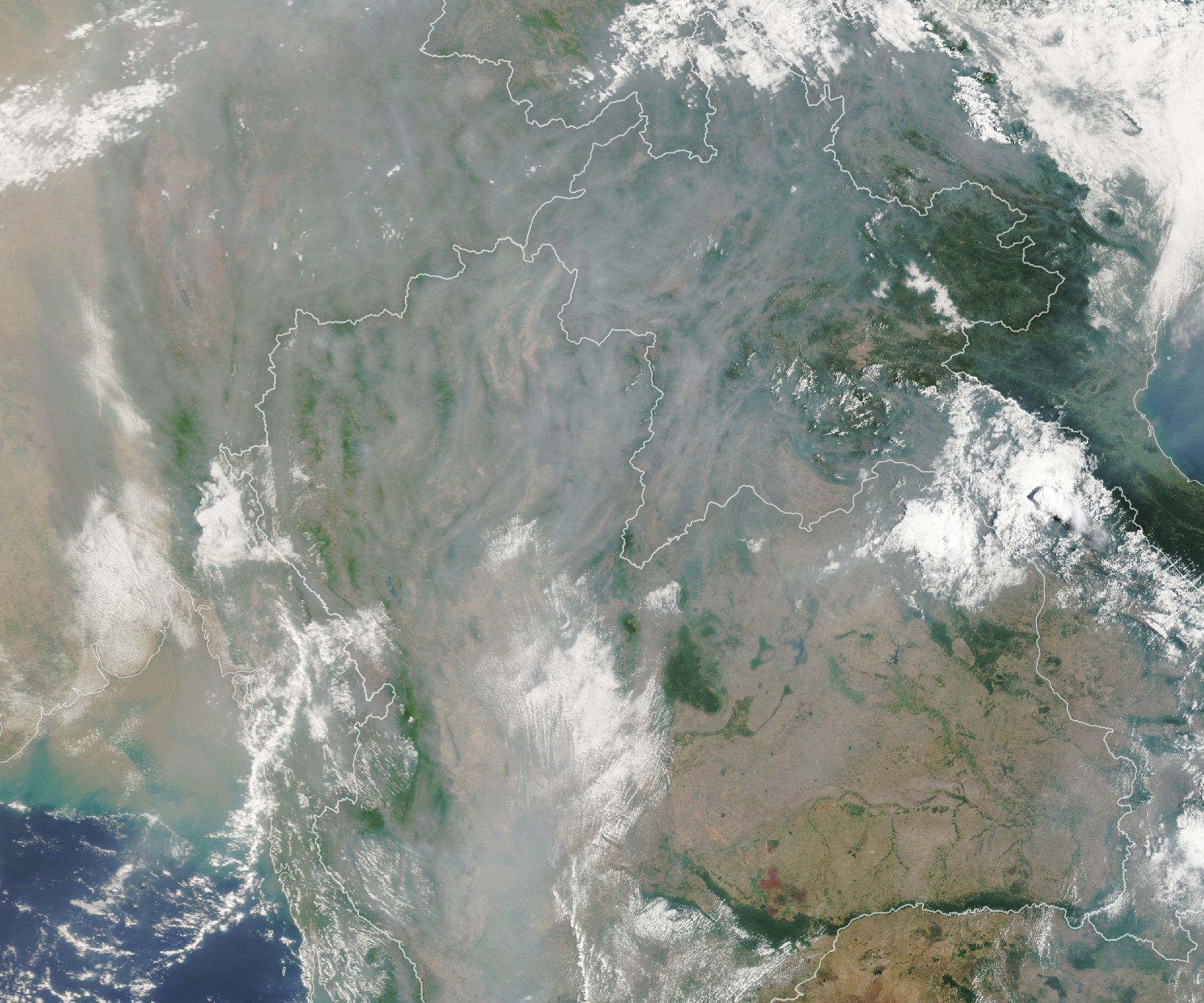 A NASA satellite captured this smoky view of the city and the surrounding region on April 22, 2026, when haze partially obscured valleys and ridges typically visible under clearer conditions. Most of the smoke likely comes from small agricultural and forest fires lit to burn off crop debris or maintain forest ecosystems. In 2026, satellite sensors detected small numbers of fires throughout January, but fire detections became more numerous and widespread in February, March, and April. Fire activity typically peaks in March and fades by May as seasonal rains increase.