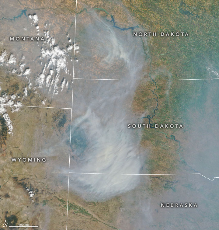 This natural-color image shows smoke from the western fires settling over the Black Hills and northern plains on September 7, 2022. The image was acquired by the Moderate Resolution Imaging Spectroradiometer (MODIS) on NASA’s Terra satellite. The smoky skies should make for spectacular sunrises and sunsets, but they are also degrading air quality with a “campfire” smell and small particulates that can enter the human lungs and impair breathing. The smoke was expected to reach the northeastern U.S. by September 9.
