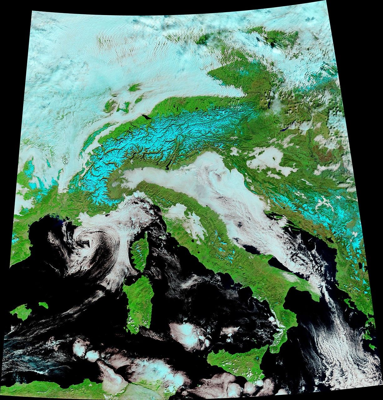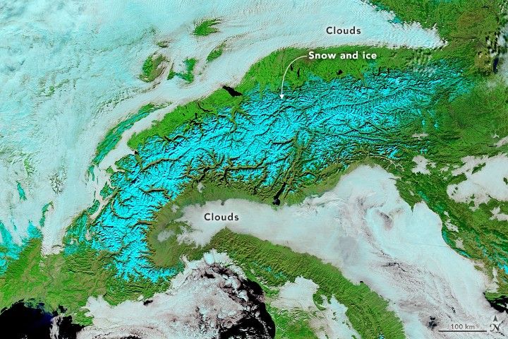 On January 29, 2018, the Moderate Resolution Imaging Spectroradiometer (MODIS) on NASA’s Terra satellite acquired these images of snow cover and low clouds around the Alps. The first image uses natural color, while the second uses a combination of visible and shortwave infrared light (bands 7-2-1) to distinguish clouds and fog in the foothills from the snow and ice cover on the peaks.
