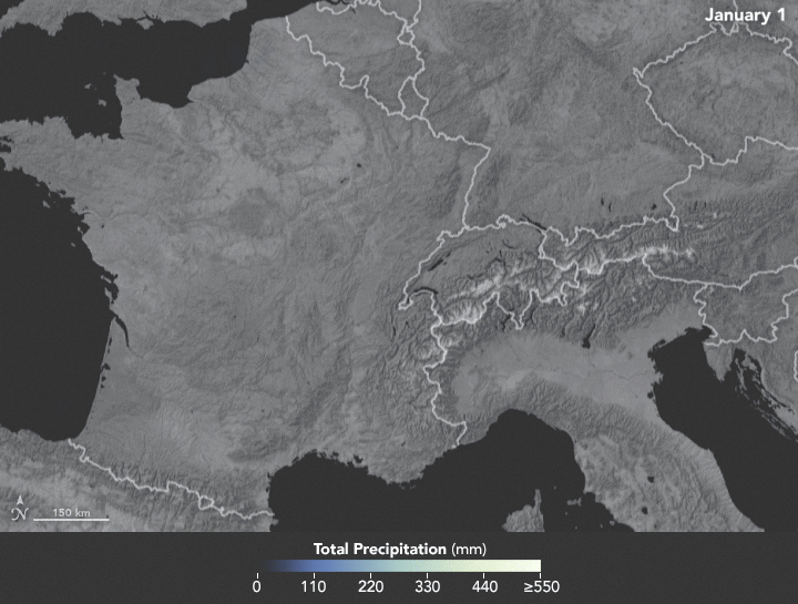 The animation below depicts satellite-based measurements of precipitation in Western Europe from January 1 to 25, 2018. The brightest areas reflect the highest precipitation amounts. The measurements are a product of the Global Precipitation Measurement (GPM) mission, which is a partnership between NASA, the Japan Aerospace Exploration Agency, and five other national and international partners.