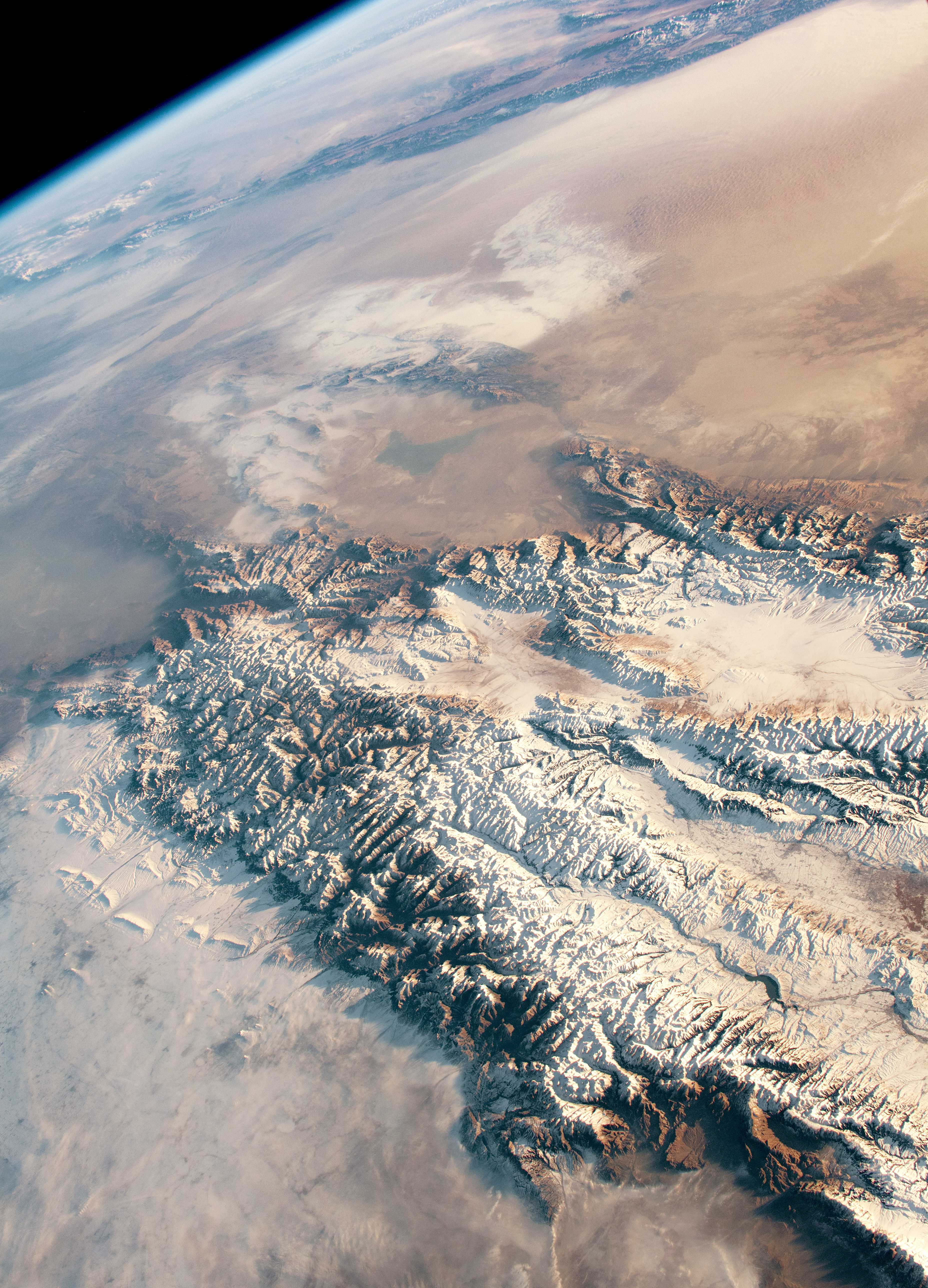 In December 2018, an astronaut on the International Space Station (ISS) took this highly oblique photograph of snow on the eastern Tien Shan and Taklimakan Desert in Central Asia. The Tien Shan (or Tian Shan) is one of the longest continuous mountain ranges in the world, stretching across 1,500 miles (2,500 kilometers) in northwest China, Kazakhstan, and Kyrgyzstan.