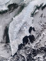 The Kamchatka Peninsula sports nearly 70 active volcanoes, although most of them appear calm in this scene. The Moderate Resolution Imaging Spectroradiometer (MODIS) on NASA’s Aqua satellite captured this natural-color image on December 19, 2011. Snow blankets most of the peninsula, but the relatively dark area likely results from that area’s lower elevation and resulting lighter snow cover. Acquired two days shy of the winter solstice, this scene shows low-angled sunlight that causes several volcanoes to cast long shadows to the north.