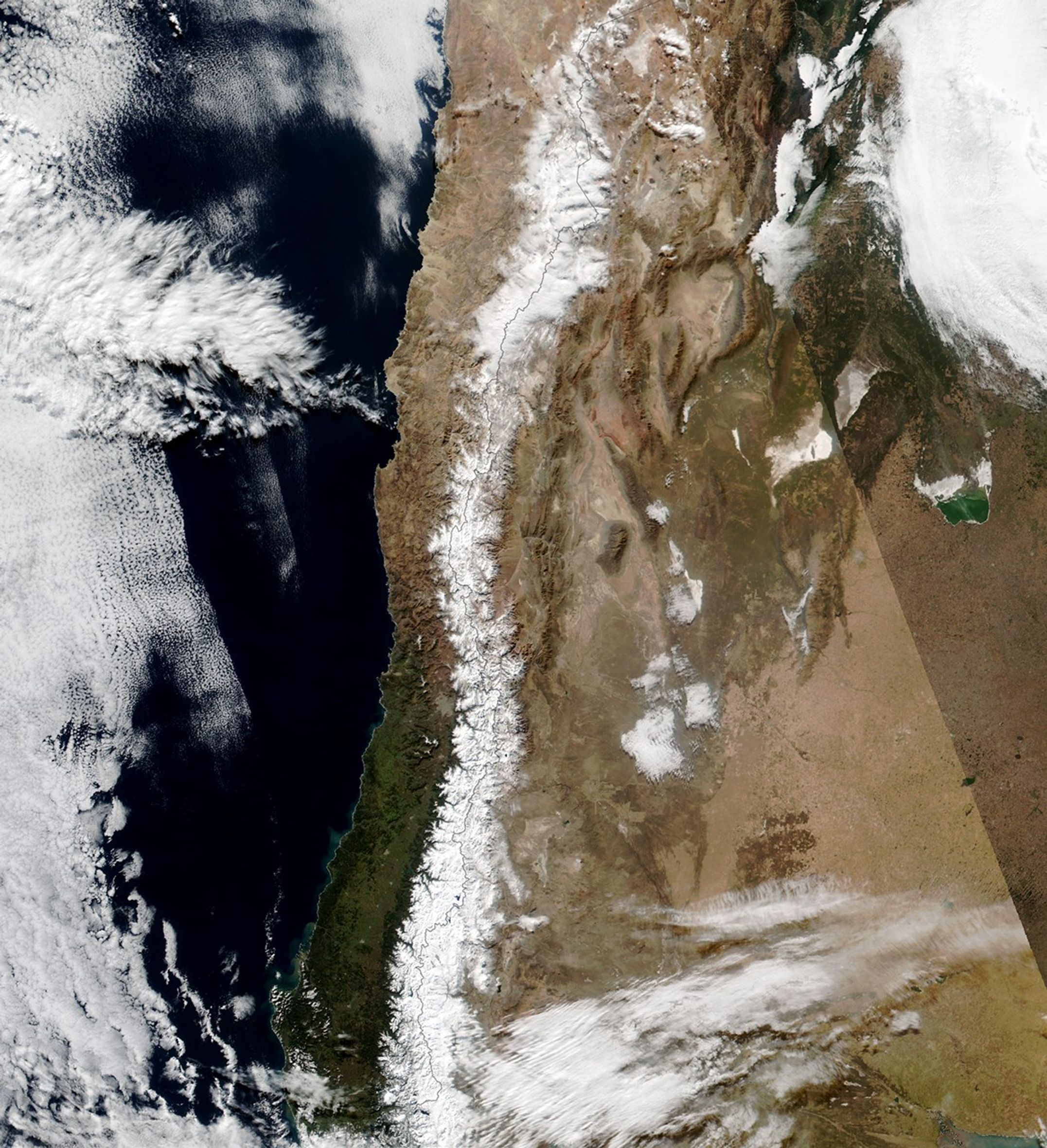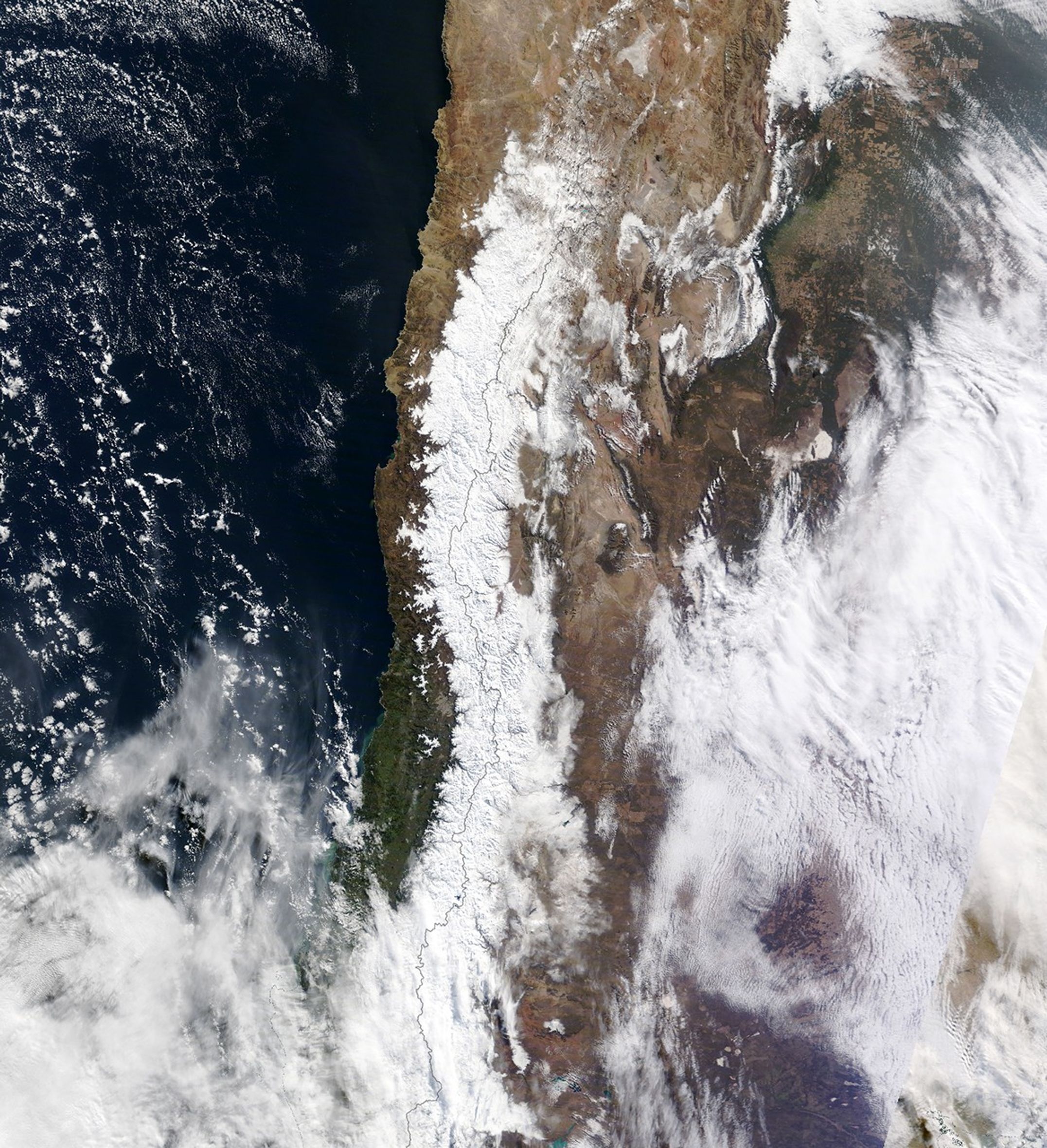 The blanket of fresh snow along the mountain range between Chile and Argentina is visible in the image above, acquired on July 16 by the Moderate Resolution Imaging Spectroradiometer (MODIS) on NASA’s Terra satellite. Heavy rain and snow fell in the area despite La Niña conditions offshore in the Pacific that typically bring dry winters. The precipitation brought at least some temporary relief to an area suffering a decade-long drought.