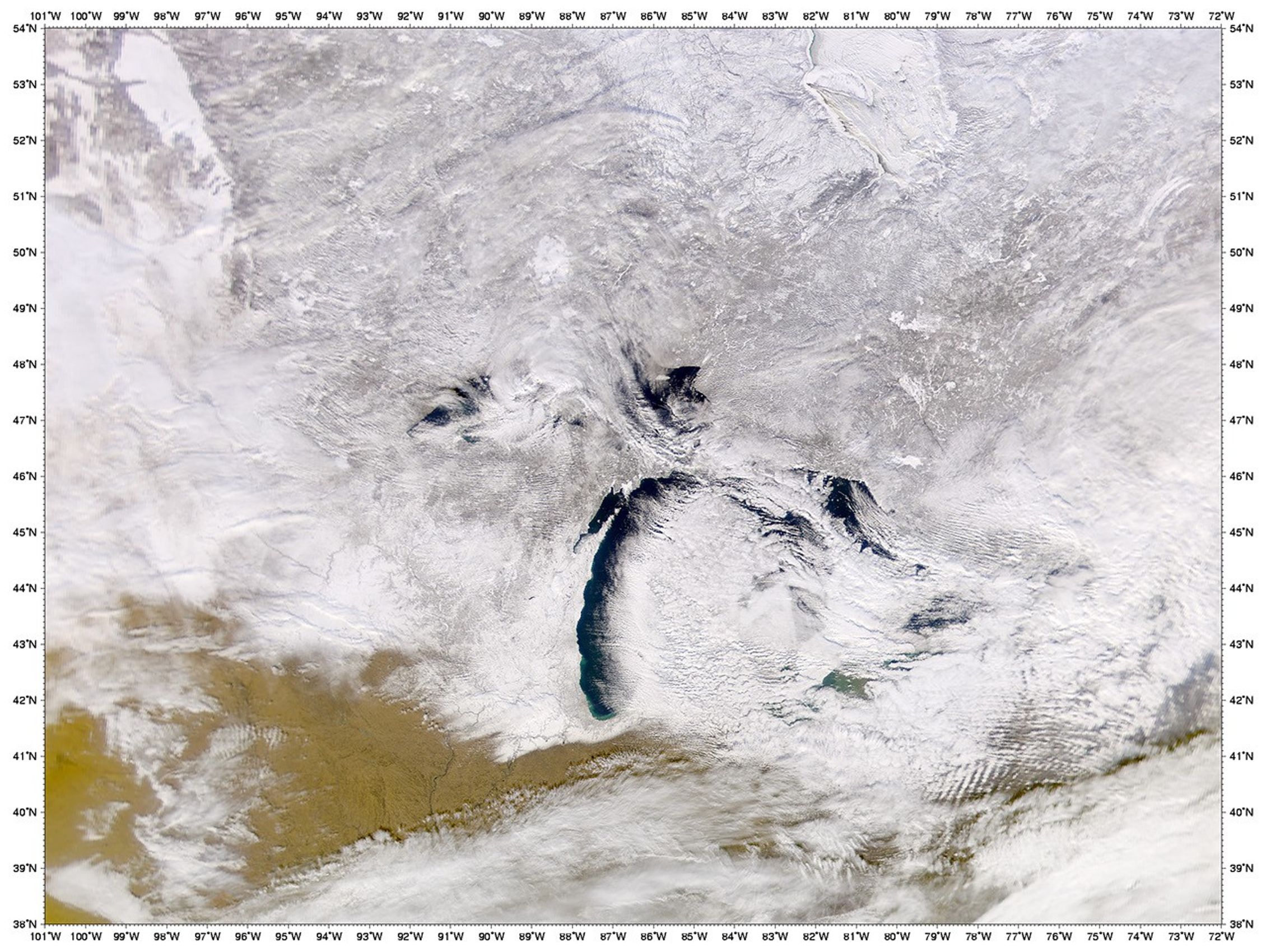 Except for cloudy areas in the west and east and around Lake Superior, the entire Canadian portion of the broader image can be seen to be snow covered as well. Lake Winnipeg (upper left) and James Bay (upper right of center) are frozen over.