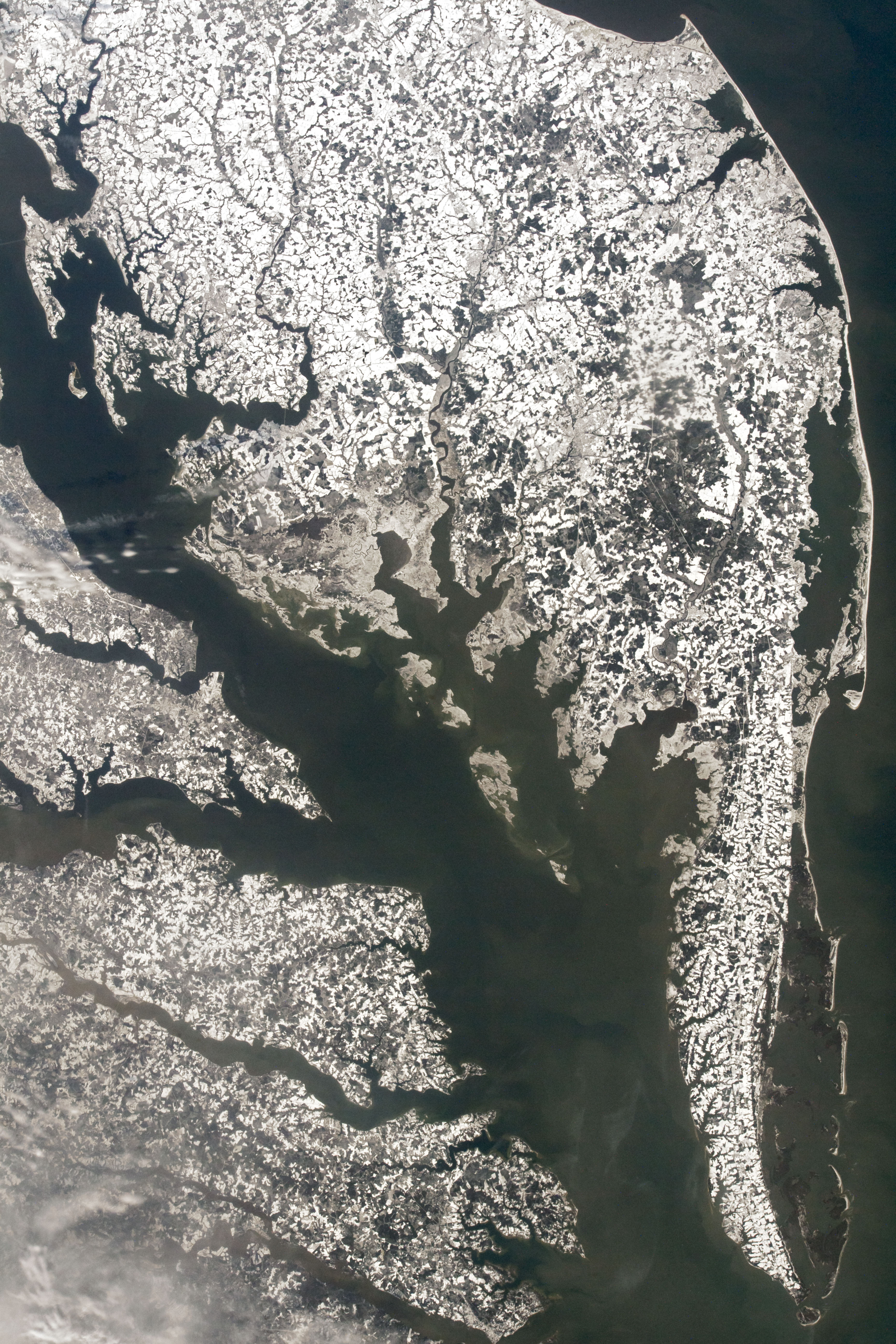 A layer of snow blanketed Virginia’s Tidewater region and the Delmarva Peninsula when an astronaut aboard the International Space Station snapped this photograph on January 30, 2022.